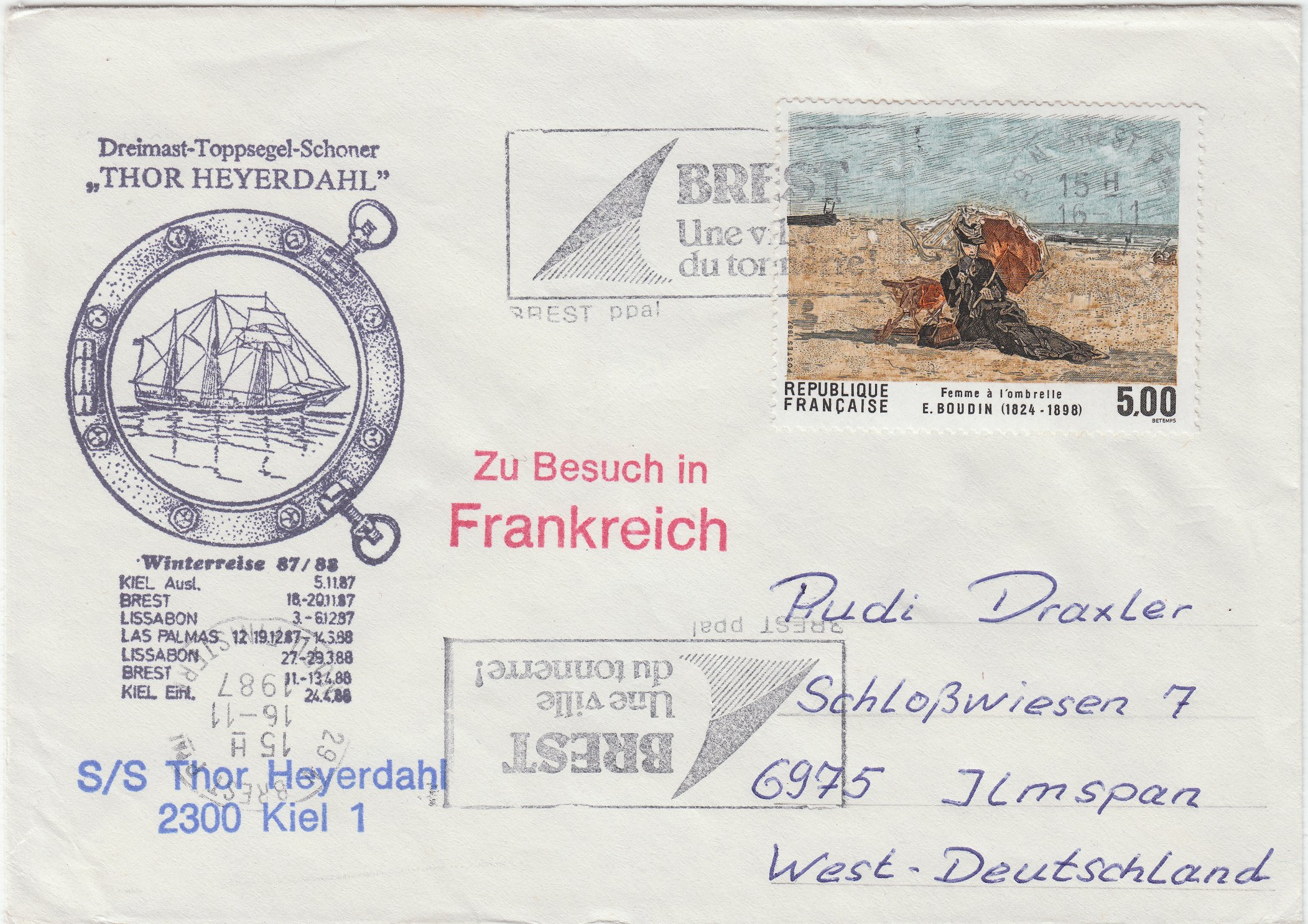 Dieser Beleg dokumentiert am 16.11.1987 die Ankunft der SS THOR HEYERDAHL in Brest während der Winterreise 1987/8: