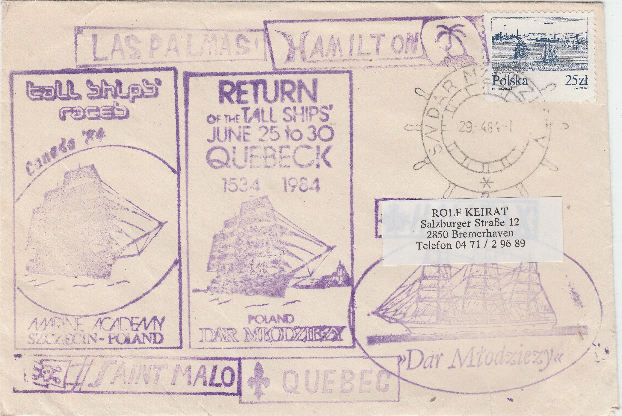 Dokumentiert wurde per Cachetstempel in Violett die Rückkehr der DAR MLODZIEZY von den TALL SHIPS' RACES, die 1984 vom 25.06. bis zum 30.06. in Quebec, Kanada, stattfanden.