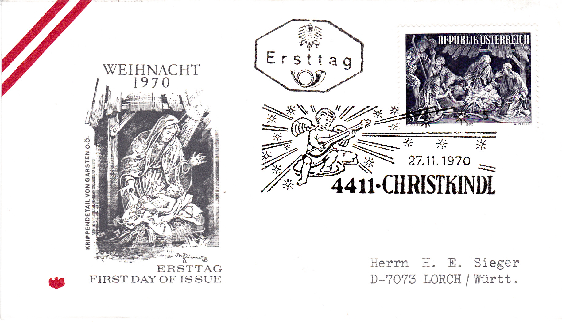 Dieser Beleg trägt einen Leitzettel "über Christkindl" und wurde am 10.12.1970 in WIEN eingeliefert, wo dieser Leitzettel per Tagesstempel entwertet wurde.