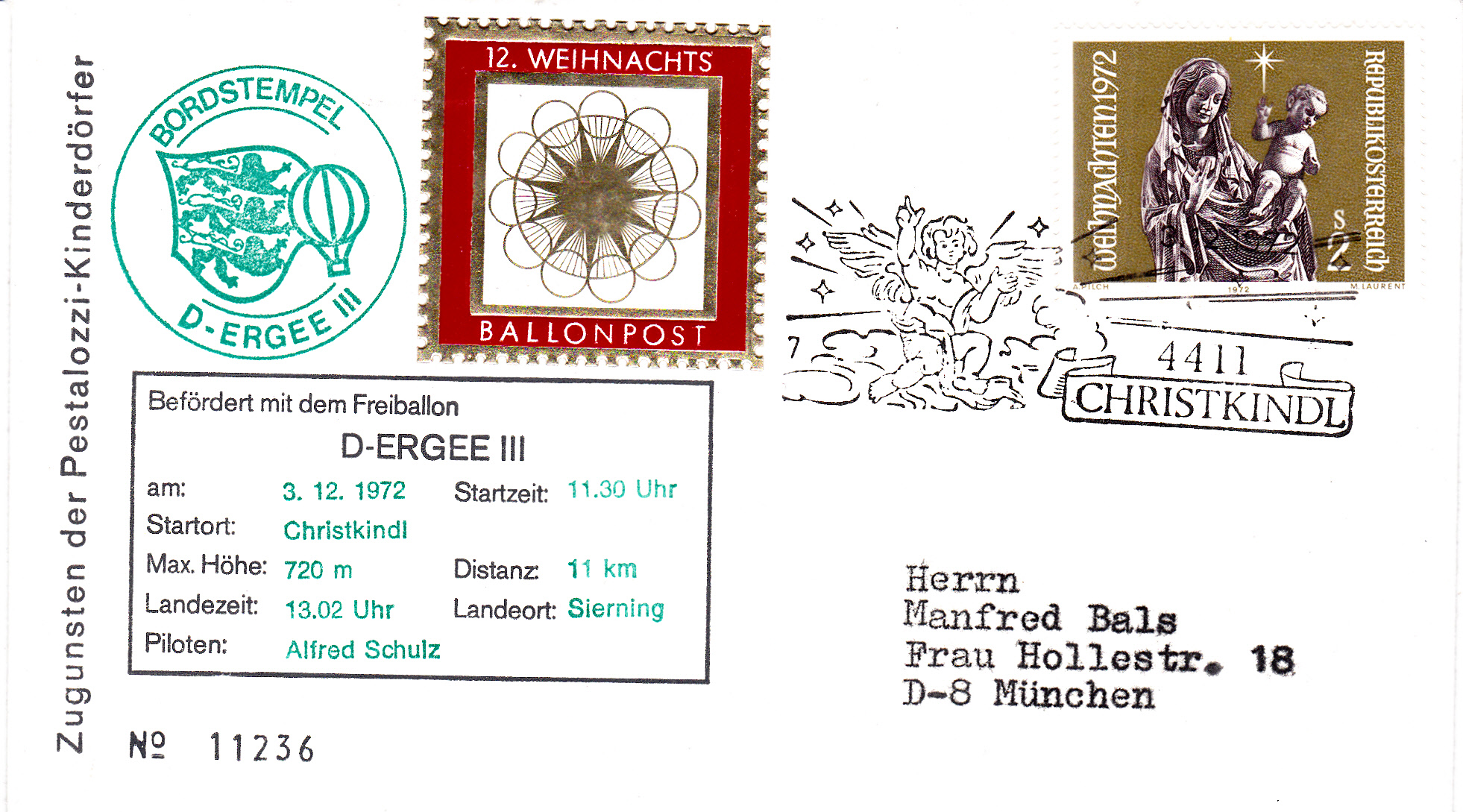 Dieser Stempel Christkindl vom 3.12.1972 hat die Kennziffer "7". Er wurde auf einem Brief der 12. Weihnachtsballonpost abgeschlagen.