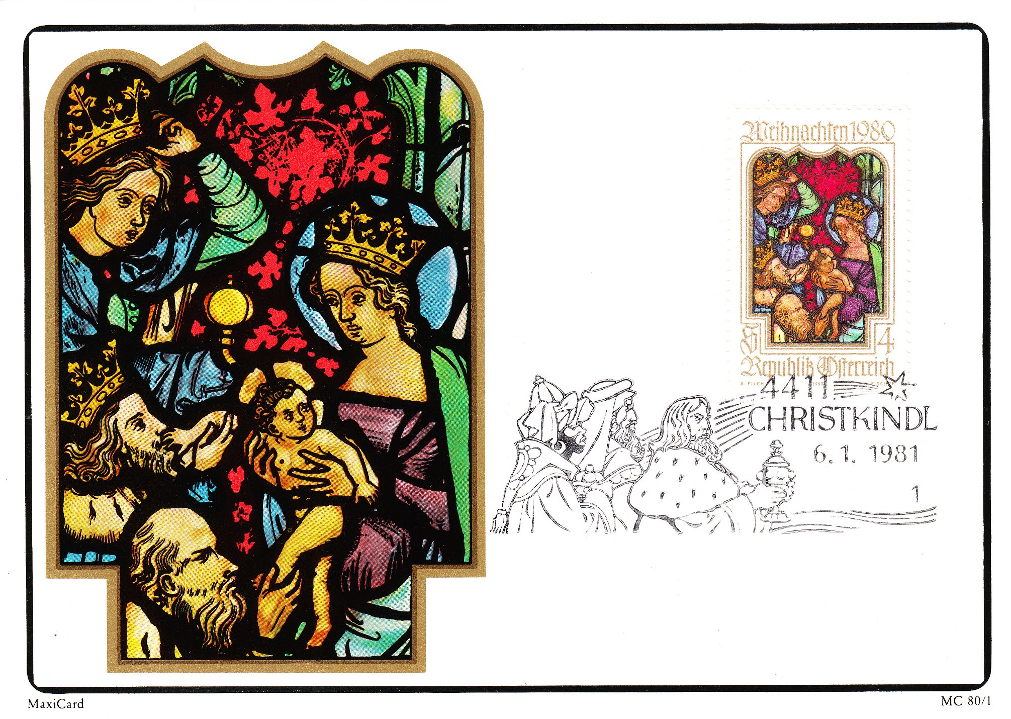 In einer Auflage von 50.000 Stück bei der Österreichischen Staatsdruckerei gedruckte "MaxiCard" mit Stempel CHRISTKINDL vom Dreikönigstag 06.01.1981: