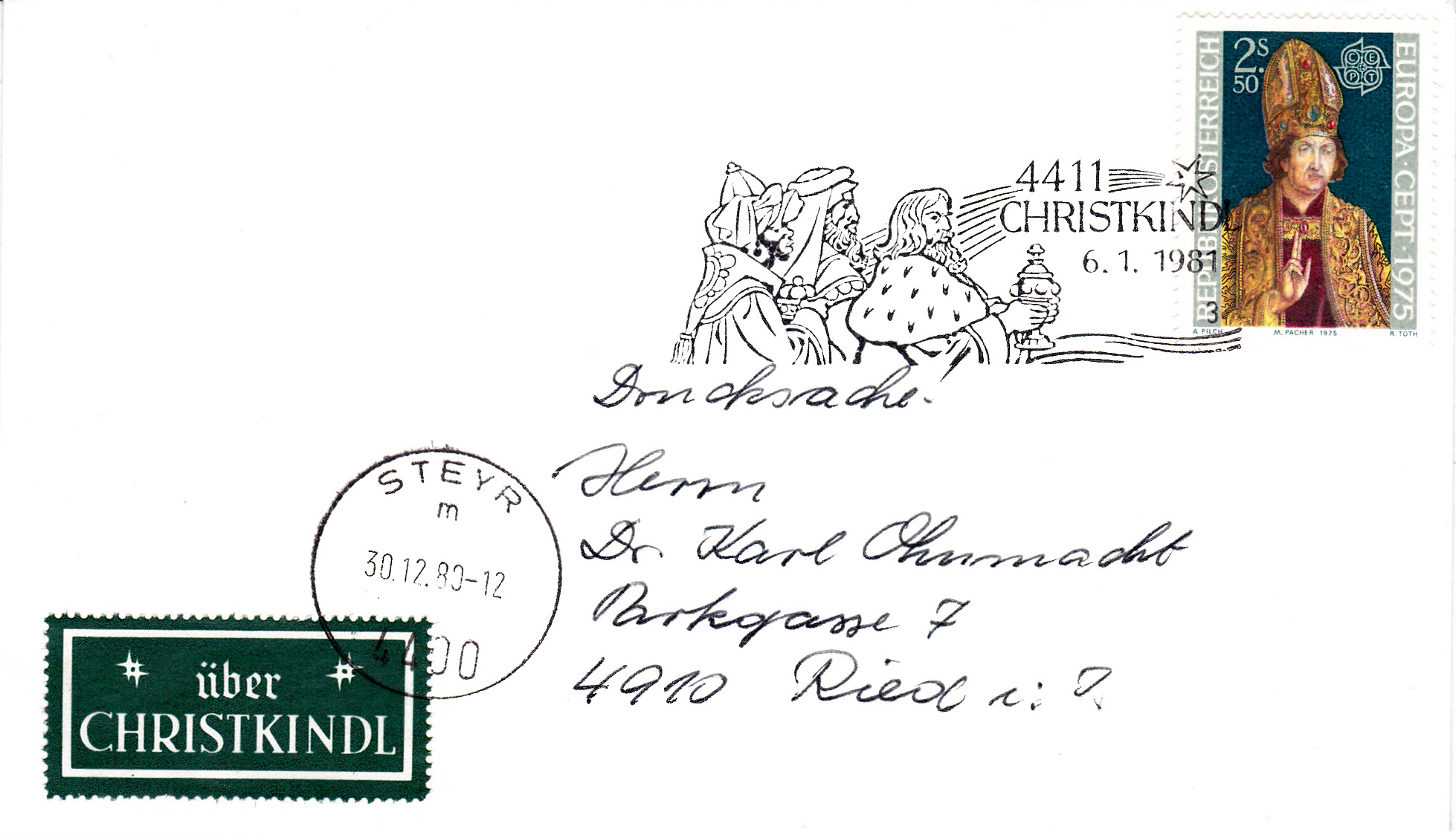 Dieser Brief wurde am 30.12.1980 in Steyr aufgegeben und in Christkindl mit einem Stempel vom 6.1.1981 mit der Kennziffer "3" gestempelt.