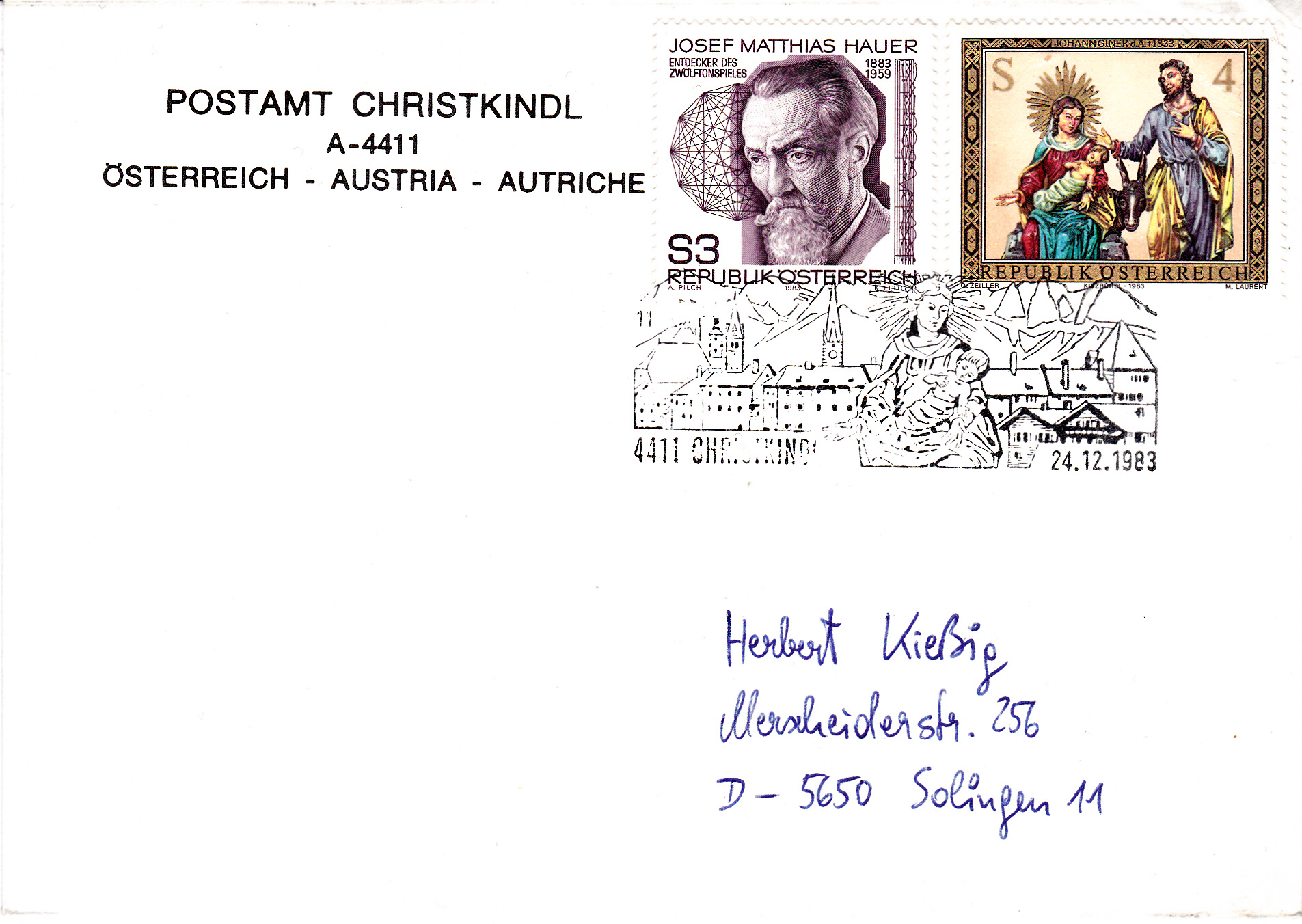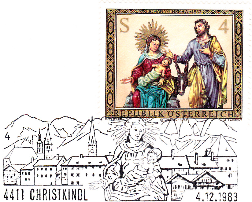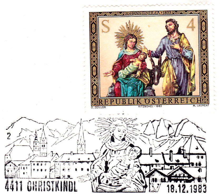 Im Stempelmotiv findet sich die Maria mit dem Jesuskind wie auf der Weihnachtsmarke 1983 von Österreich: