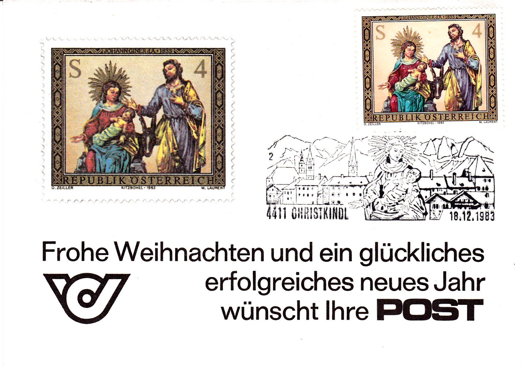 Hier folgt ein "gedruckter" Stempel Christkindl vom 24.12. 1983 ohne Kennziffer. Der "Stempel" stammt aus einer Klappkarte der Briefmarkenversandsstelle der Österreichischen Post.