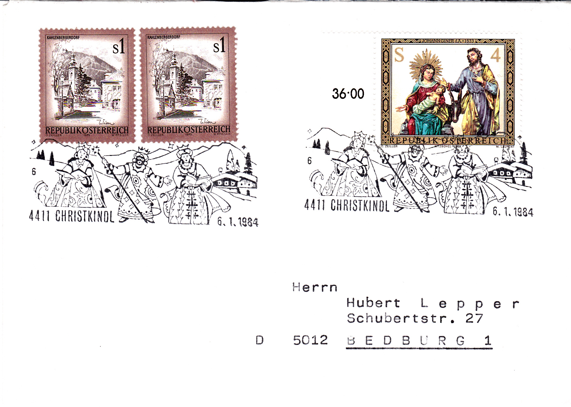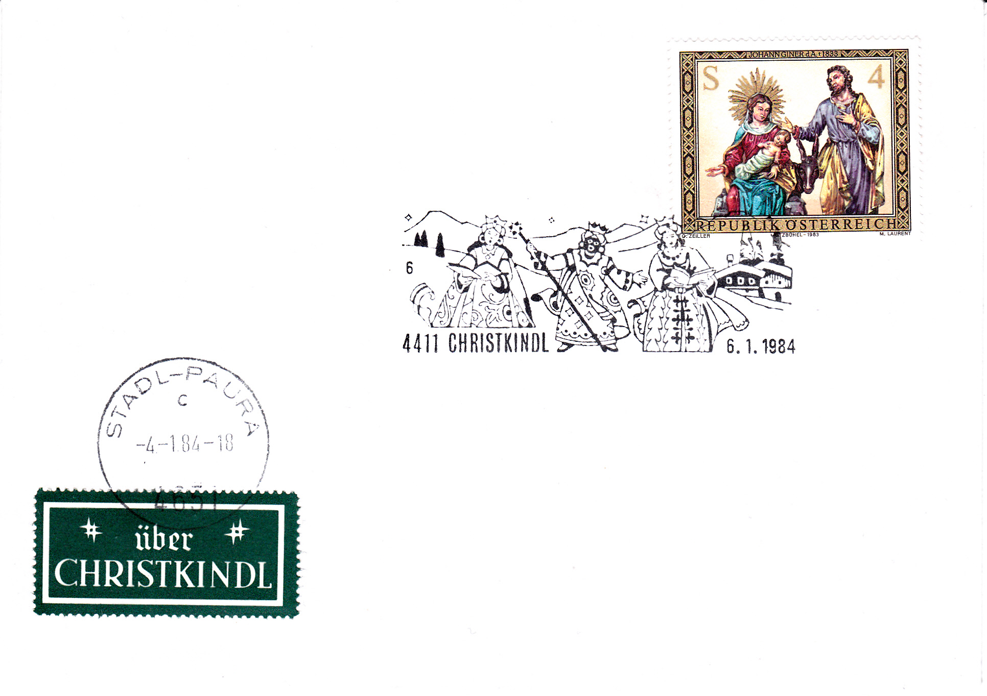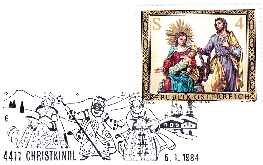Der Sonderstempel aus Christkindl mit dem Motiv "Heilige Drei Könige" wird immer in der Zeit von 27.12. eines Jahres bis zum 6.1. des Folgejahres verwendet. Hier ein Stempel vom letzten Verwendungstag (6.1.1984) mit der Kennziffer "6", den ich also mal dem Jahre 1983 zuordne, da es auch frühere Stempeldaten aus dem Jahre 1983 gibt.