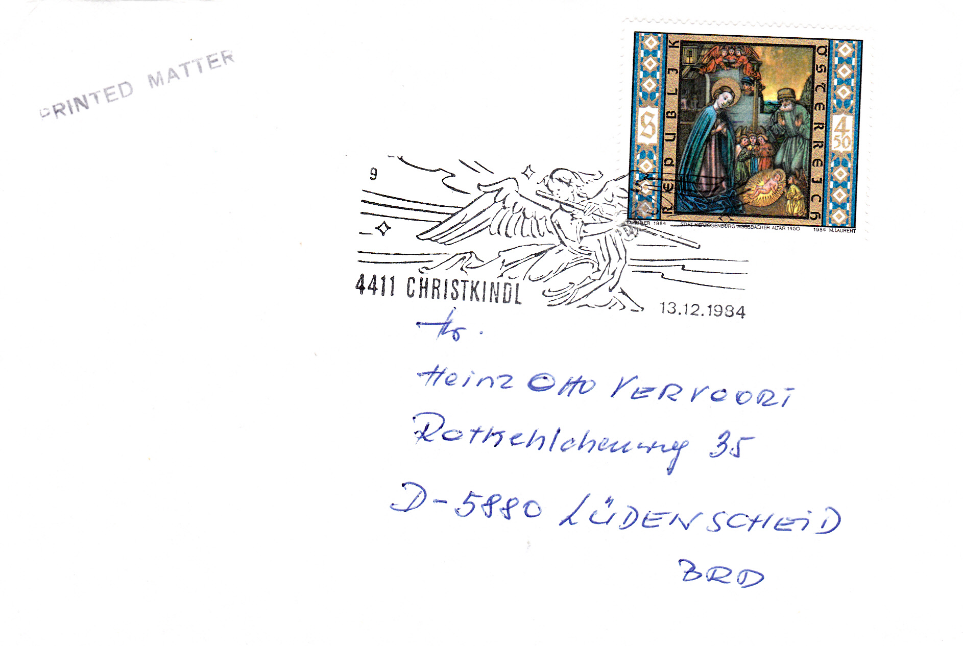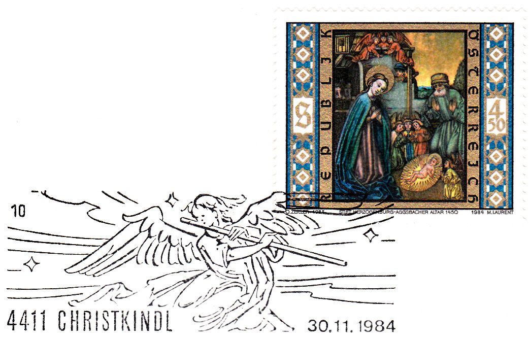 Der Sonderstempel "Christkindl" aus dem Jahre 1984 zeigt einen musizierenden Engel. Hier ein Abschlag vom 24.12.1984 mit der Kennziffer "1". Er stammt aus einer Weihnachtsklappkarte der Briefmarkenversandstelle der Österreichischen Post.