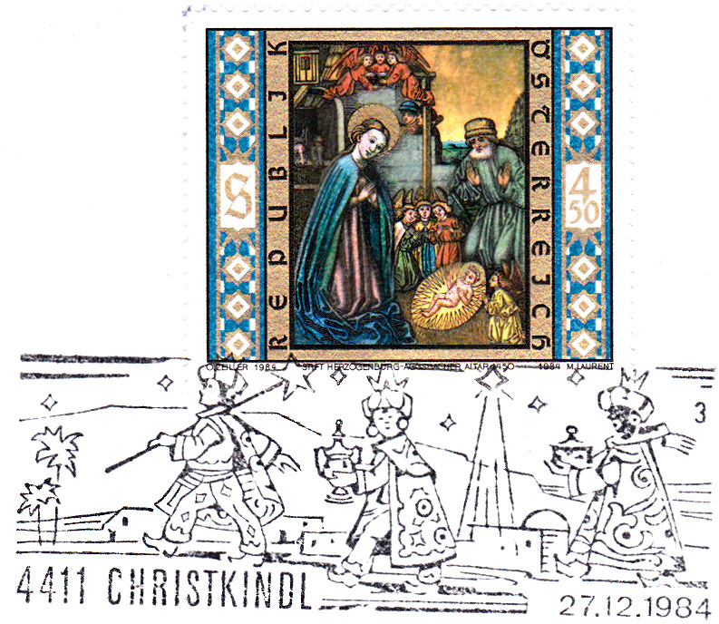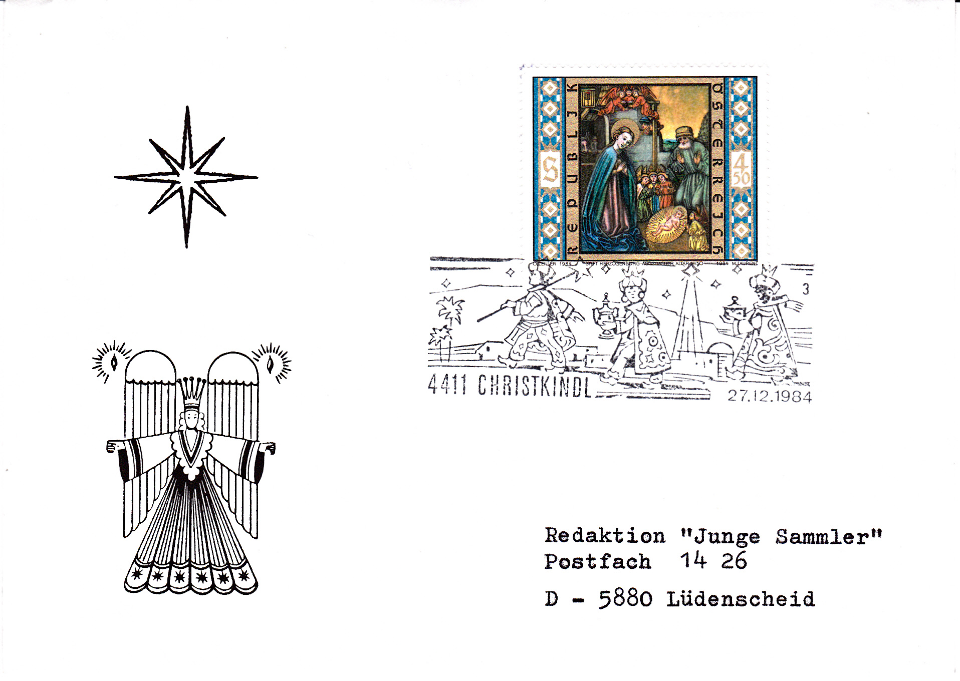 Auf diesem Brief wurde der Heilige Drei Könige Stempel 1984 mit der Kennziffer "4" am letzten Verwendungstag, dem 6.1.1985 abgeschlagen.