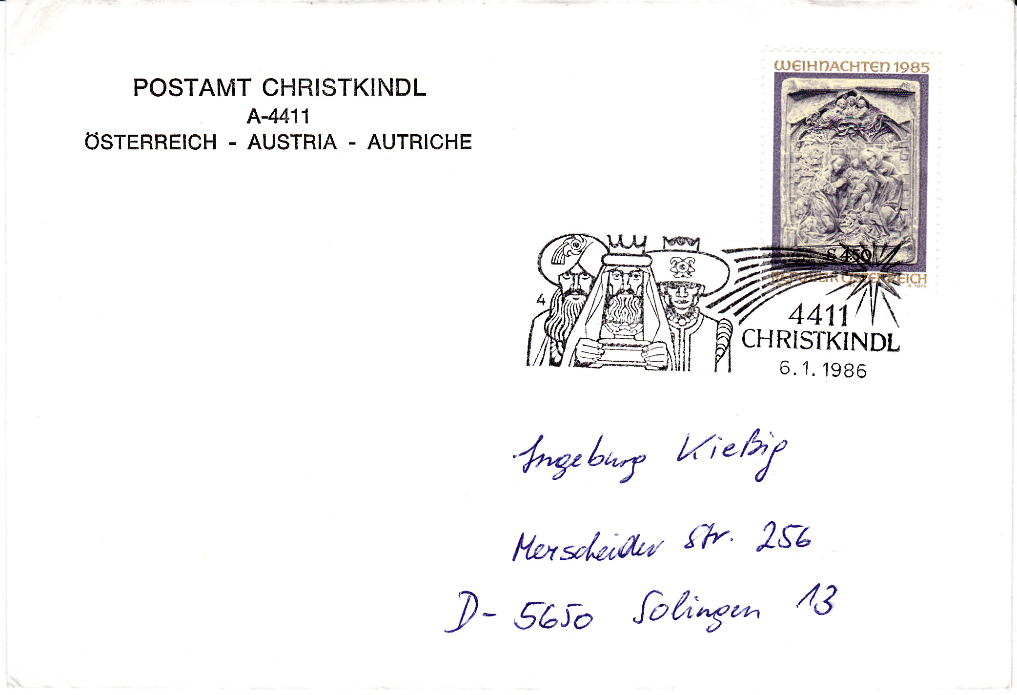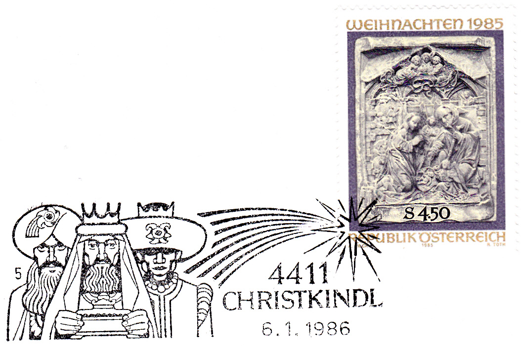 Der Sonderstempel aus Christkindl mit einem Motiv "Heilige Drei Könige" wird immer in der Zeit von 27.12. eines Jahres bis zum 6.1. des Folgejahres verwendet. Hier ein Stempel vom letzten Verwendungstag (6.1.1986) mit der Kennziffer "4".