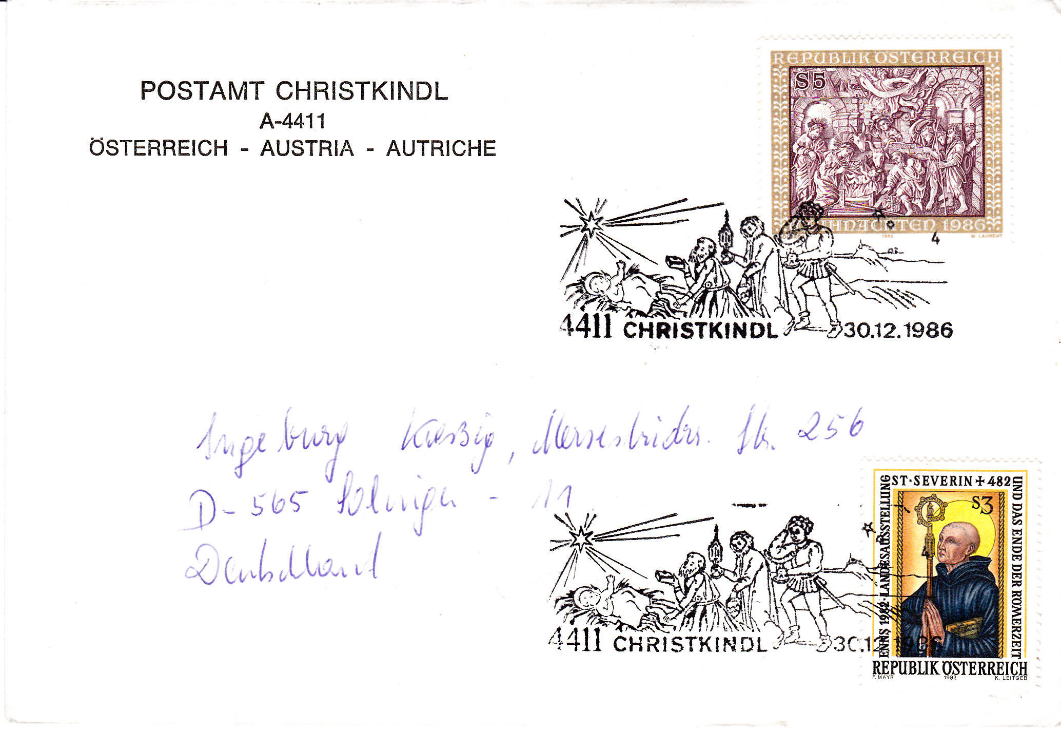 Dieser Brief wurde am 2.1.1987 in Stadl-Paura mit dem Leitzettel "über Christkindl" verschickt und die Marke am 6.1.1987 in Christkindl mit dem Sonderstempel mit der Kennziffer "3" entwertet.