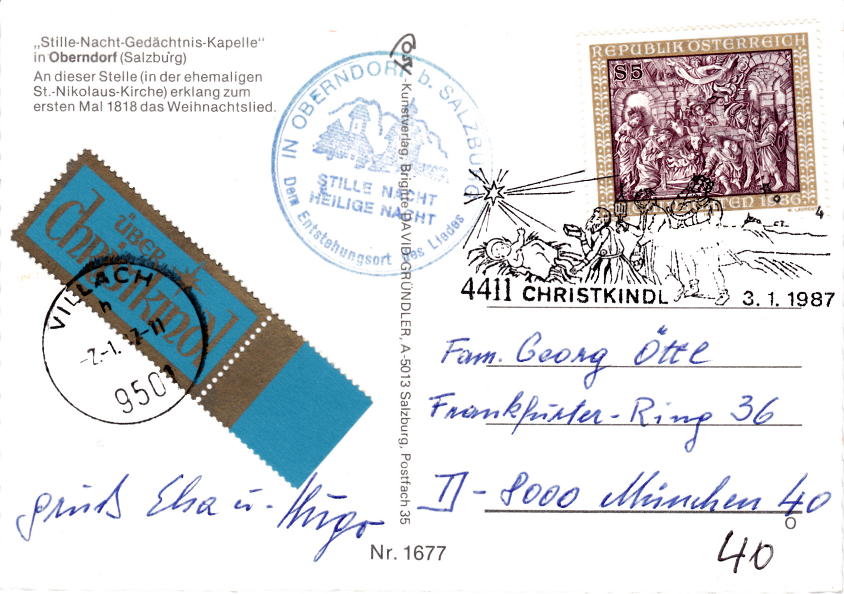 Diese Karte wurde am 2.1.1987 in Villach mit dem Leitzettel "über Christkindl" verschickt und die Marke am 3.1.1987 in Christkindl mit dem Sonderstempel mit der Kennziffer "4" entwertet.