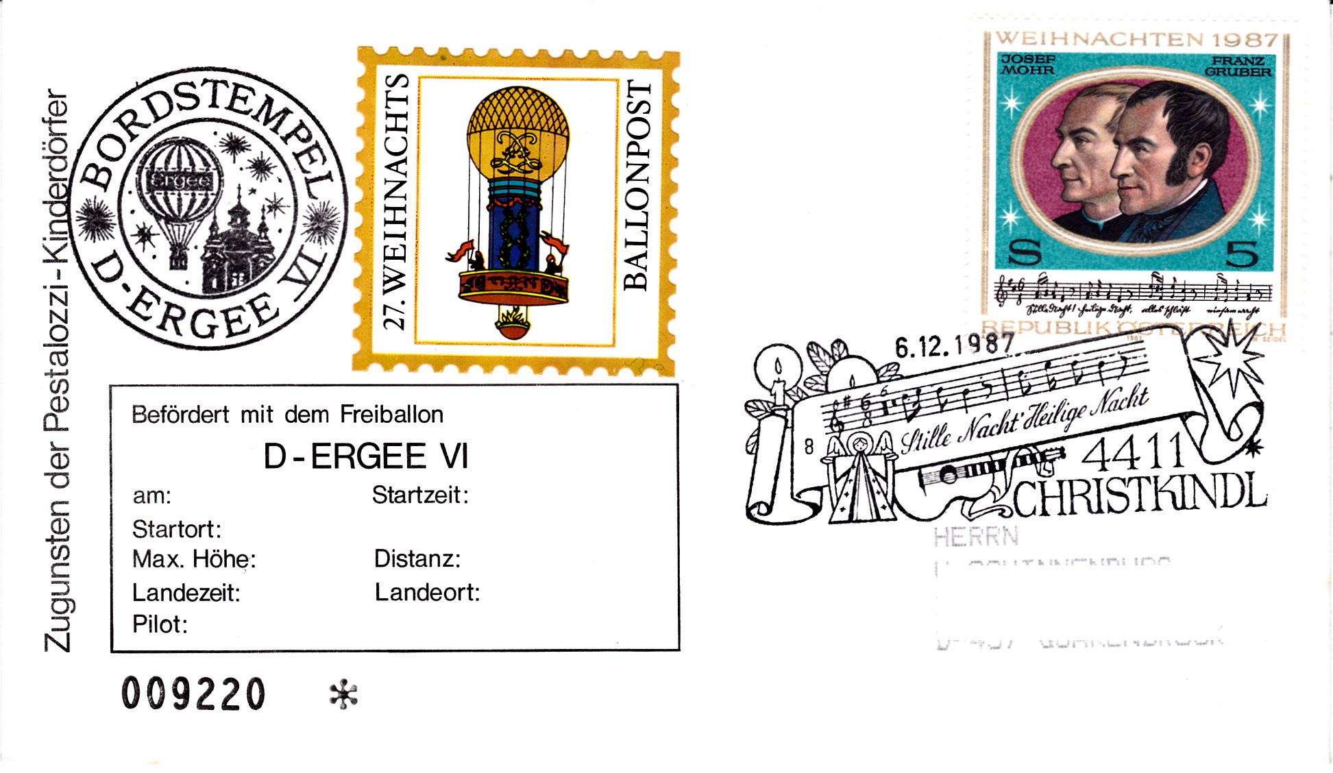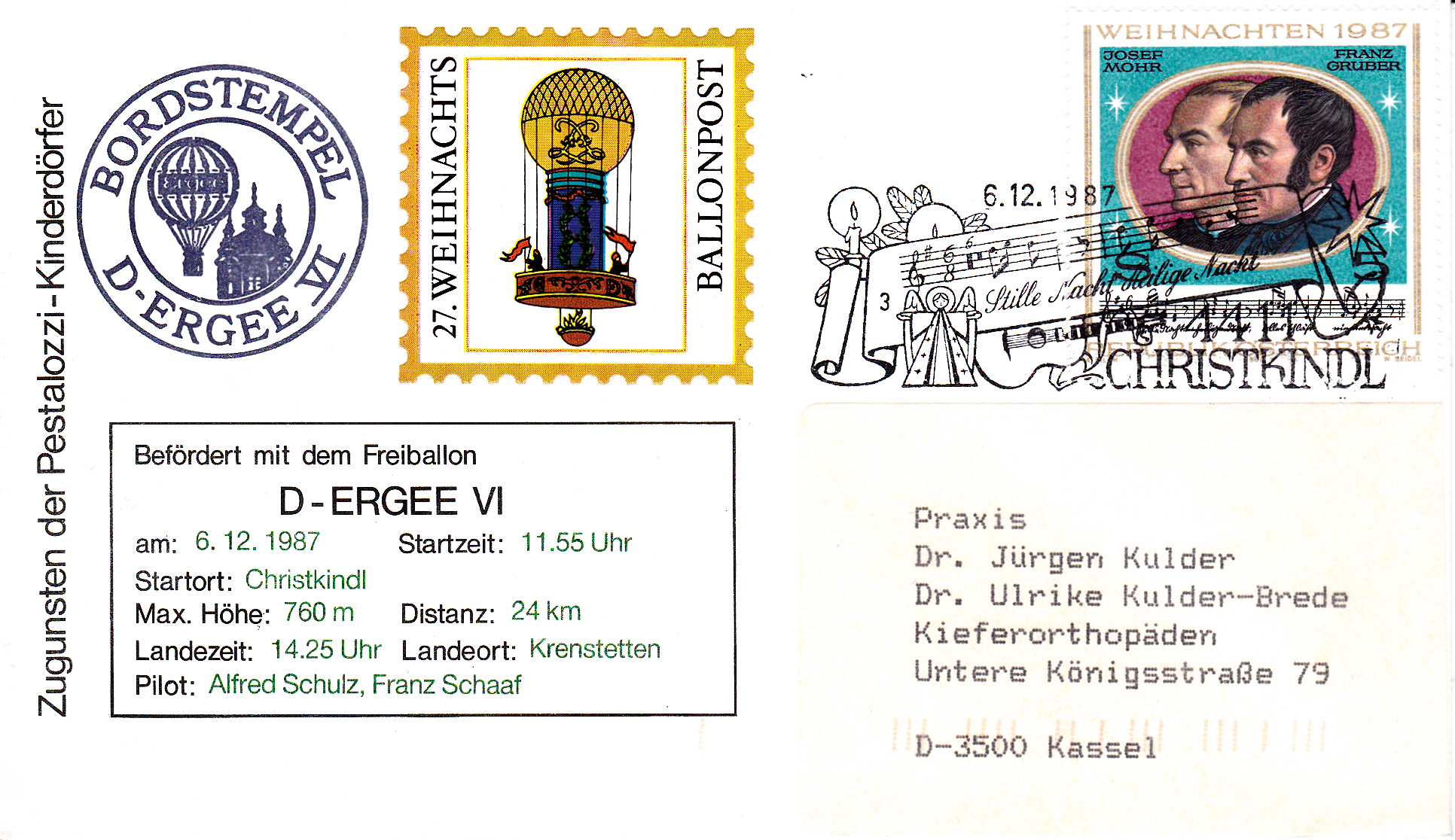 Hier wurde der Sonderstempel Christkindl 1987 mit der Kennziffer "3" am 6.12.1987 auf einem Beleg zur 27. Weihnachtsballonpost der Pestalozzi-Kinderdörfer abgeschlagen.