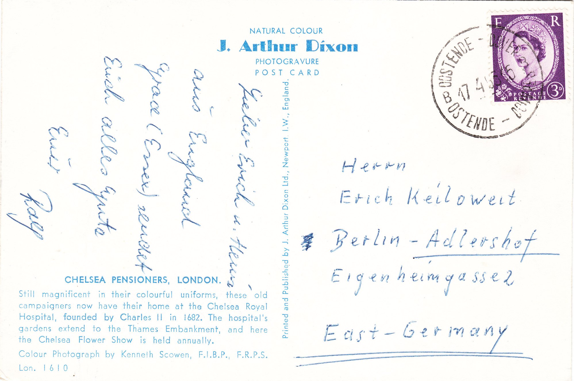 Diese Ansichtskarte wurde laut Text am 17.07.1952 um 14:20 Uhr im Eisenbahnabteil geschrieben und dann während der Überfahrt des Zuges an Bord der Eisenbahnfähre aufgegeben, was ein zweisprachiger Tagesstempel vom 17.07.1952 um 18 Uhr dokumentiert: