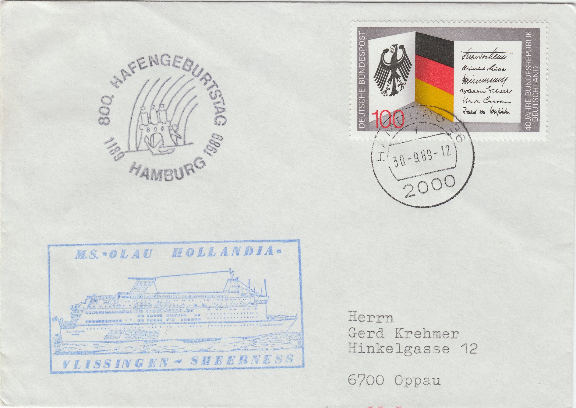 Die MS OLAU HOLLANDIA war ein Fährschiff der PETER PAN-Klasse der OLAU Line, das zwischen Vlissingen (NL) und Sheerness (GB) verkehrte. Das am 29.09.1989 an die TT-Line ausgelieferte Schiff nahm bereits einen Tag später an den offiziellen Feierlichkeiten zum 800. Hafengeburtstag in seinem Heimathafen Hamburg teil: