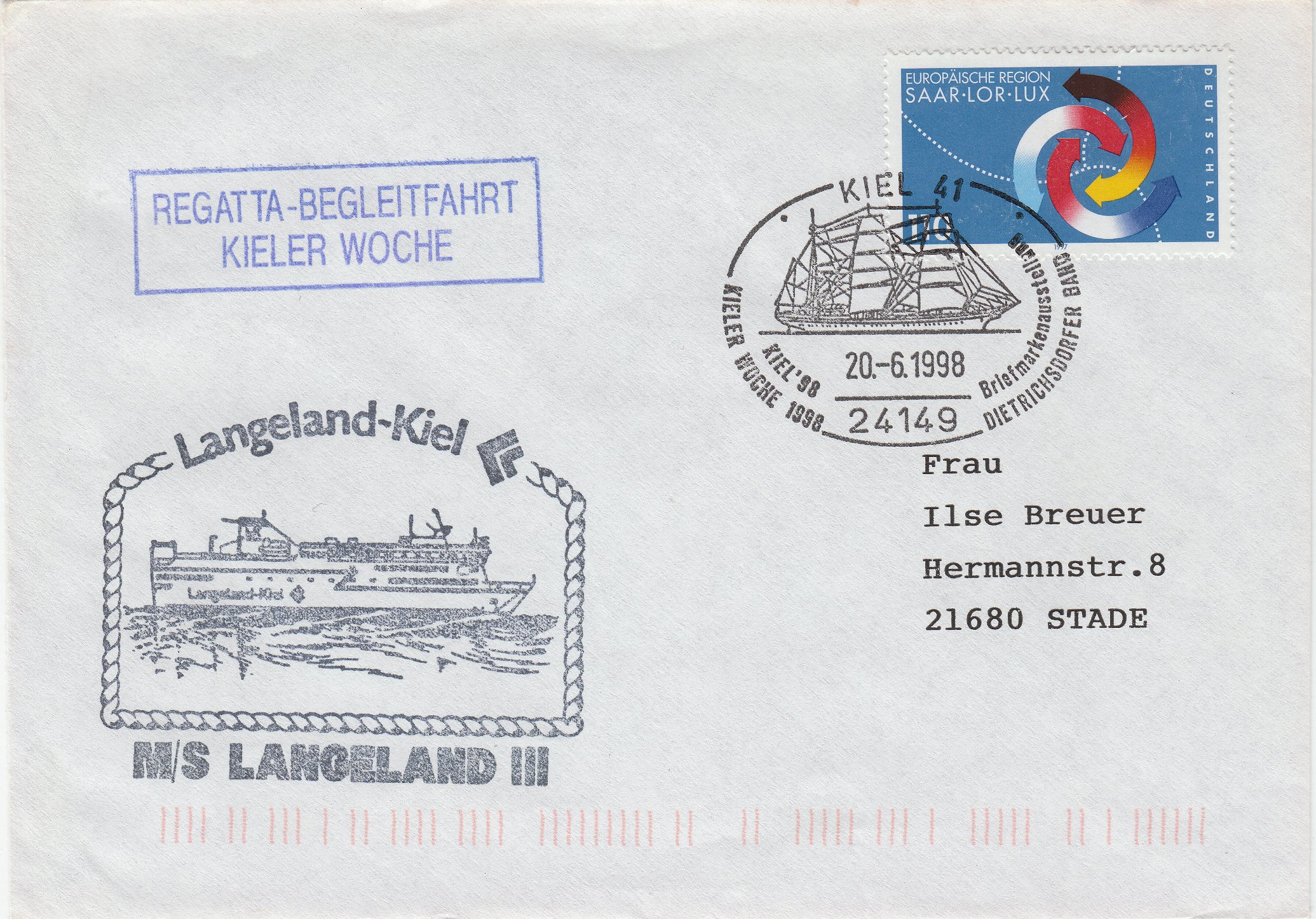 Dieser Beleg dokumentiert die Teilnahme der MS LANGELAND III an der Regatta-Begleitfahrt während der Kieler Woche am 20.06.1998: