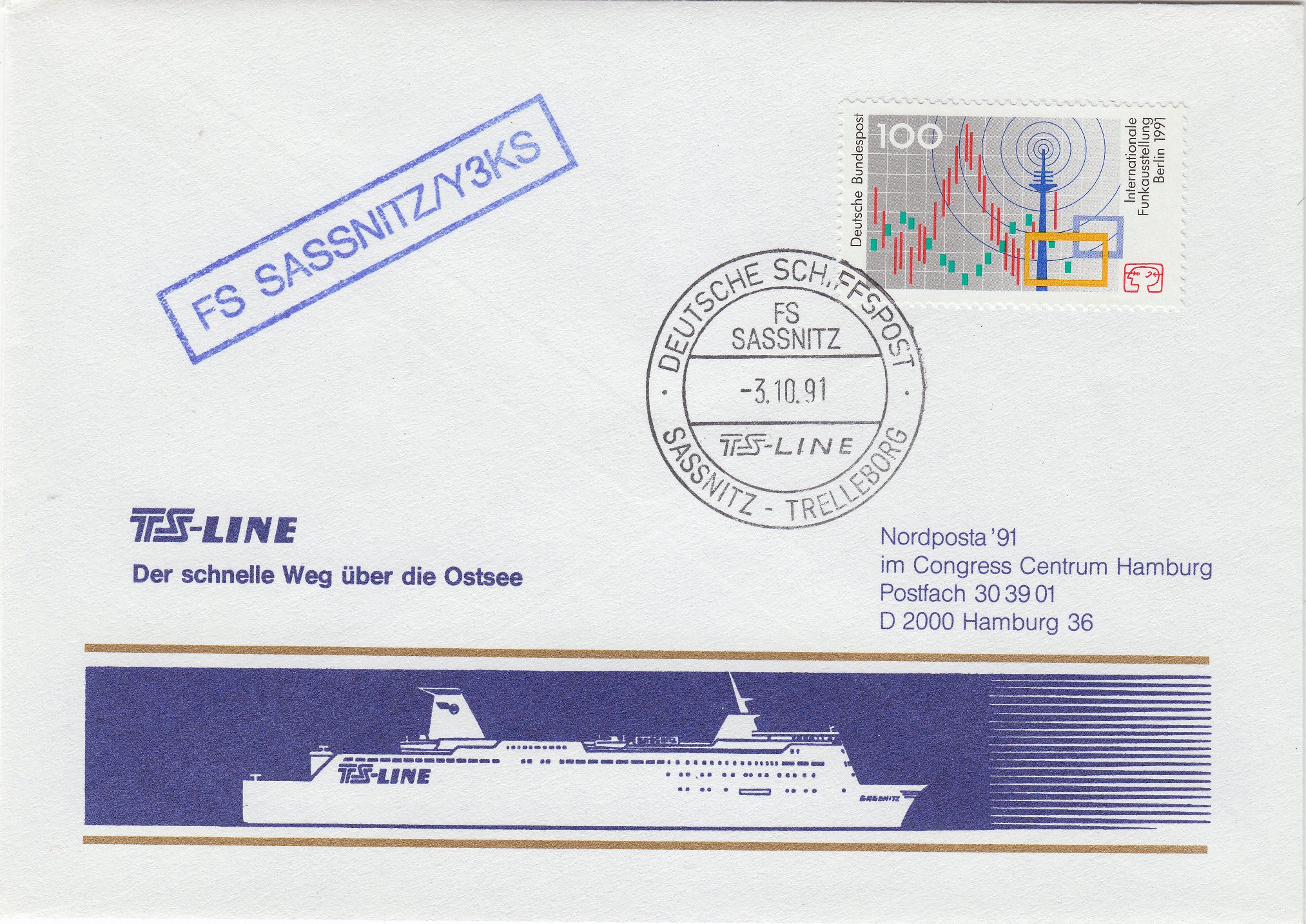 Zur Nordpost 1991 in Hamburg wurde dieser an Bord der FS SASSNITZ aufgegebene, mit Cachetstempel mit Seefunk-Rufzeichen versehene sowie mit dem Bordstempel entwertete Beleg aufgelegt: