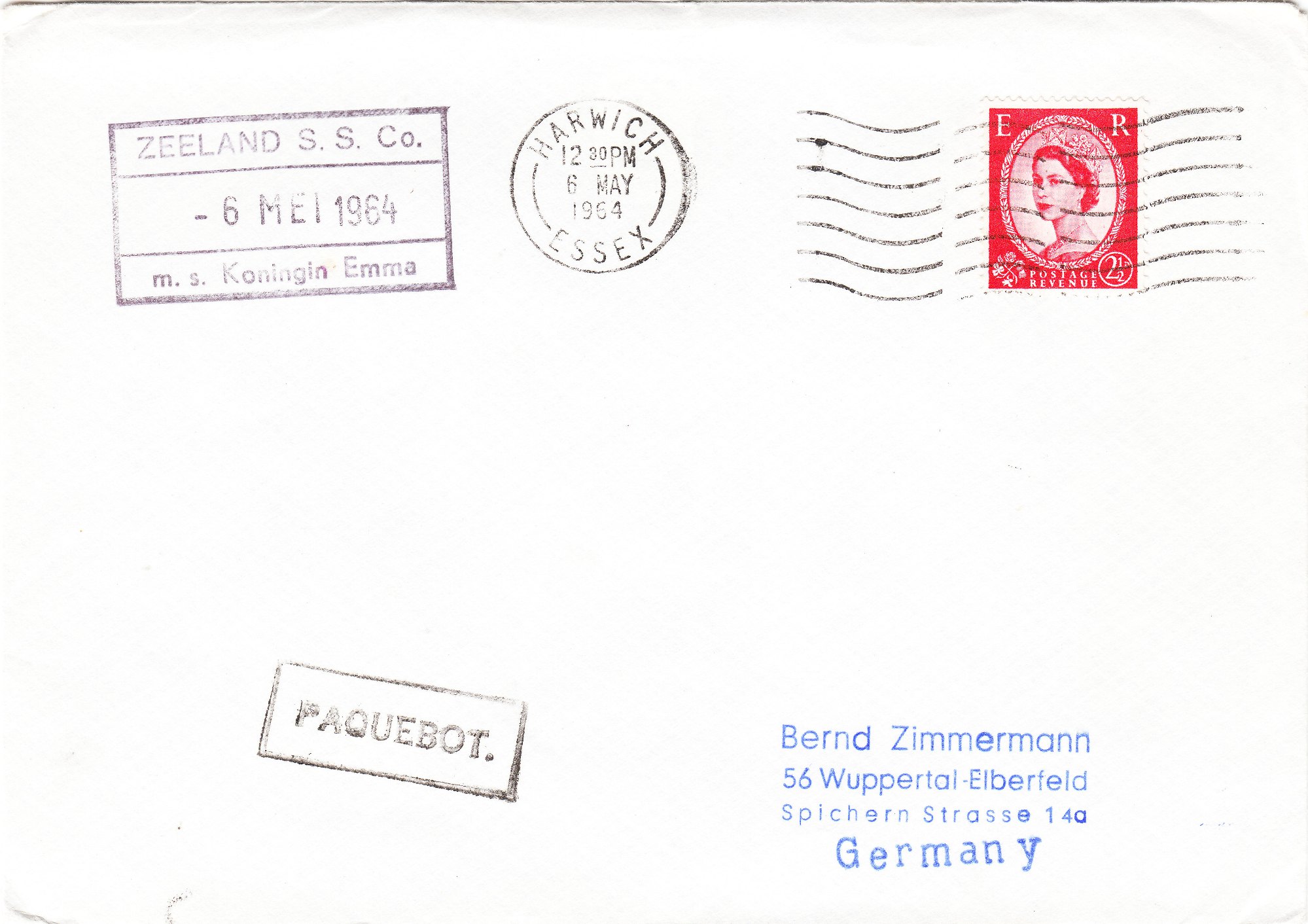 Die MS KONINGIN EMMA war ein Fährschiff der ZEELANS S. S. Co. und bediente die Route Hook van Holland - Harwich, was dieser Beleg vom 06.05.1964 dokumentiert.