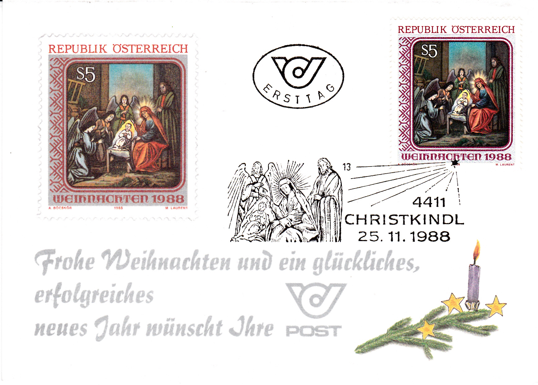 Dieser Stempel vom 25.11.1988, dem Ersttag der Weihnachtsmarke 1988, hat die Kennziffer "13". Er wurde auf der Weihnachtskarte der Österreichischen Post abgeschlagen.