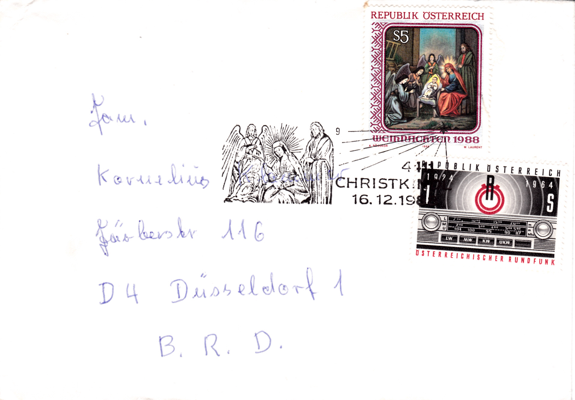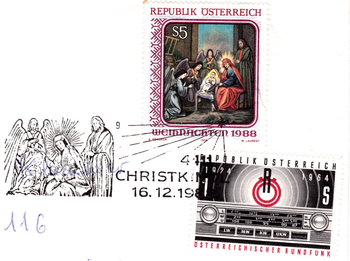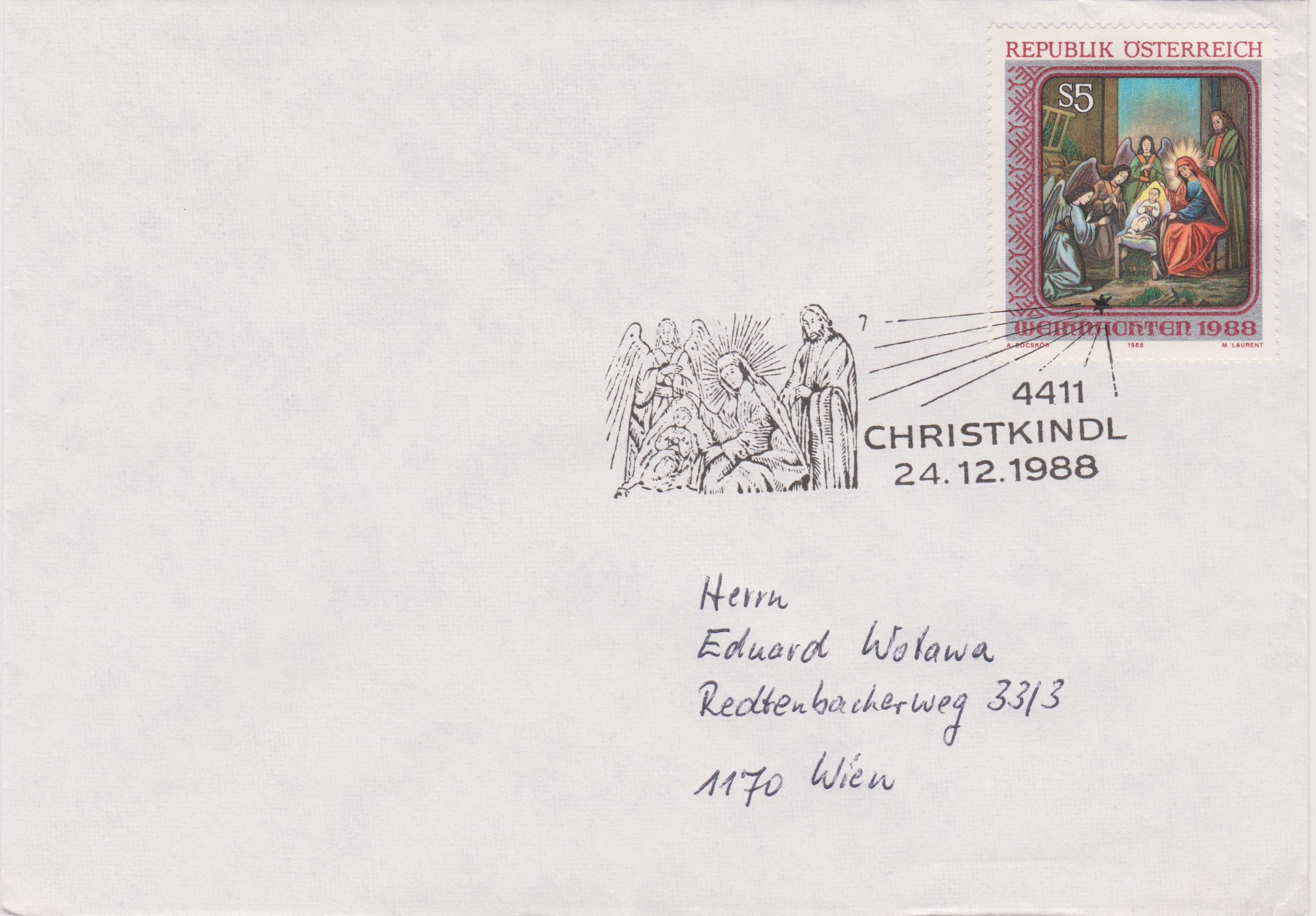 Dieser Brief wurde am 15.12.1988 in Wien mit dem Leitzettel "über Christkindl" verschickt und die Marke am 16.12.1988 in Christkindl mit dem Sonderstempel mit der Kennziffer "13" entwertet.