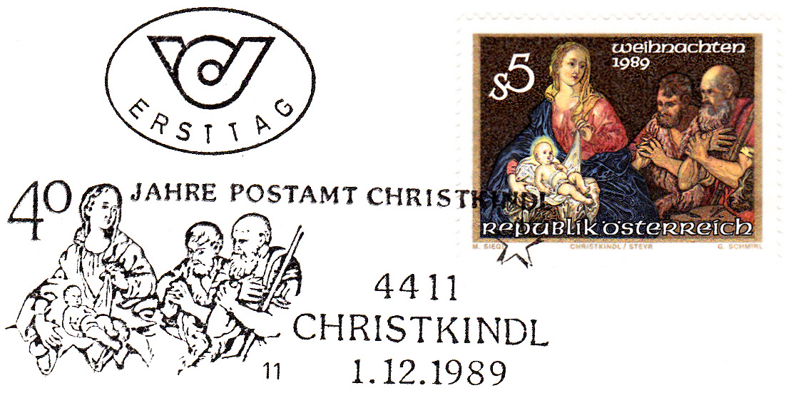 Dieser Sonderstempel vom 01.12.1989 zeigt als Motiv den inzwischen sehr selten einmal zu findenden ersten Sonderstempel aus CHRISTKINDL aus dem Jahre 1950: