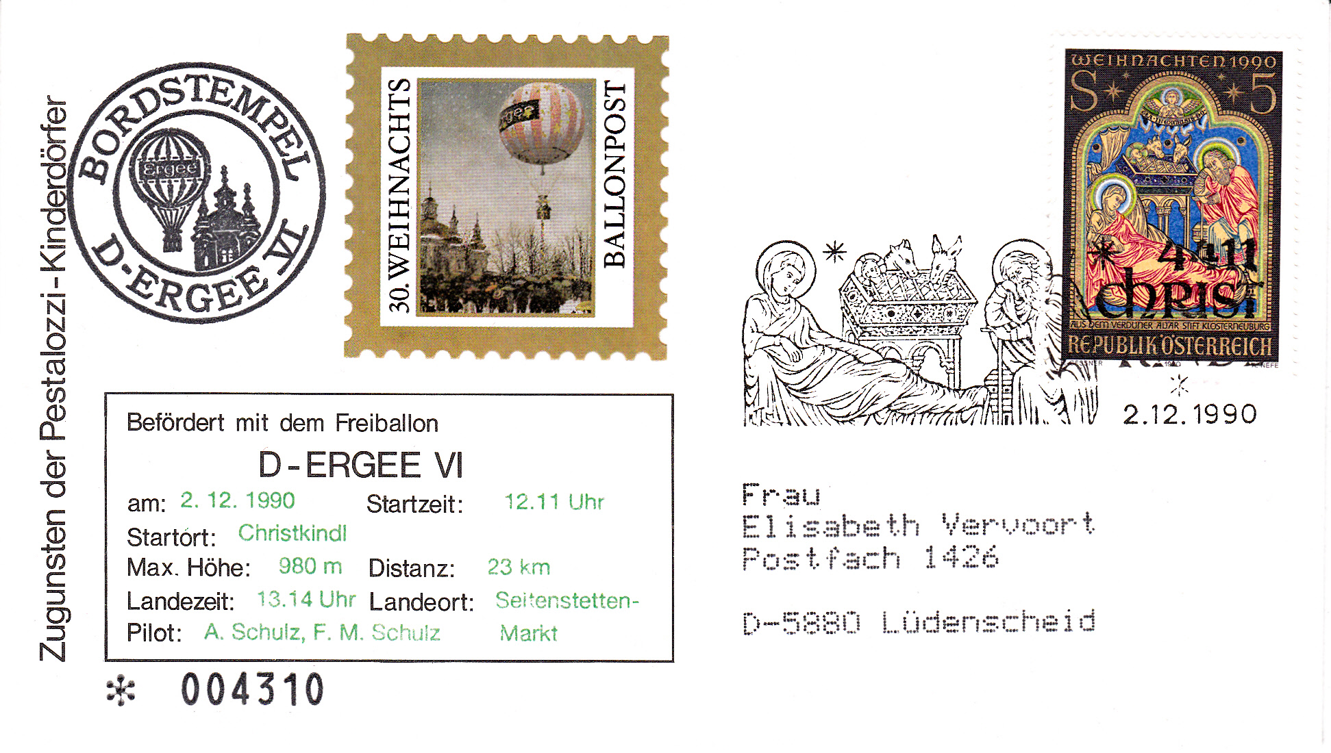 Auf diesem Umschlag zur 30. Weihnachtsballonpost wurde ein Abschlag des Stempels mit der Kennziffer "7" angebracht.