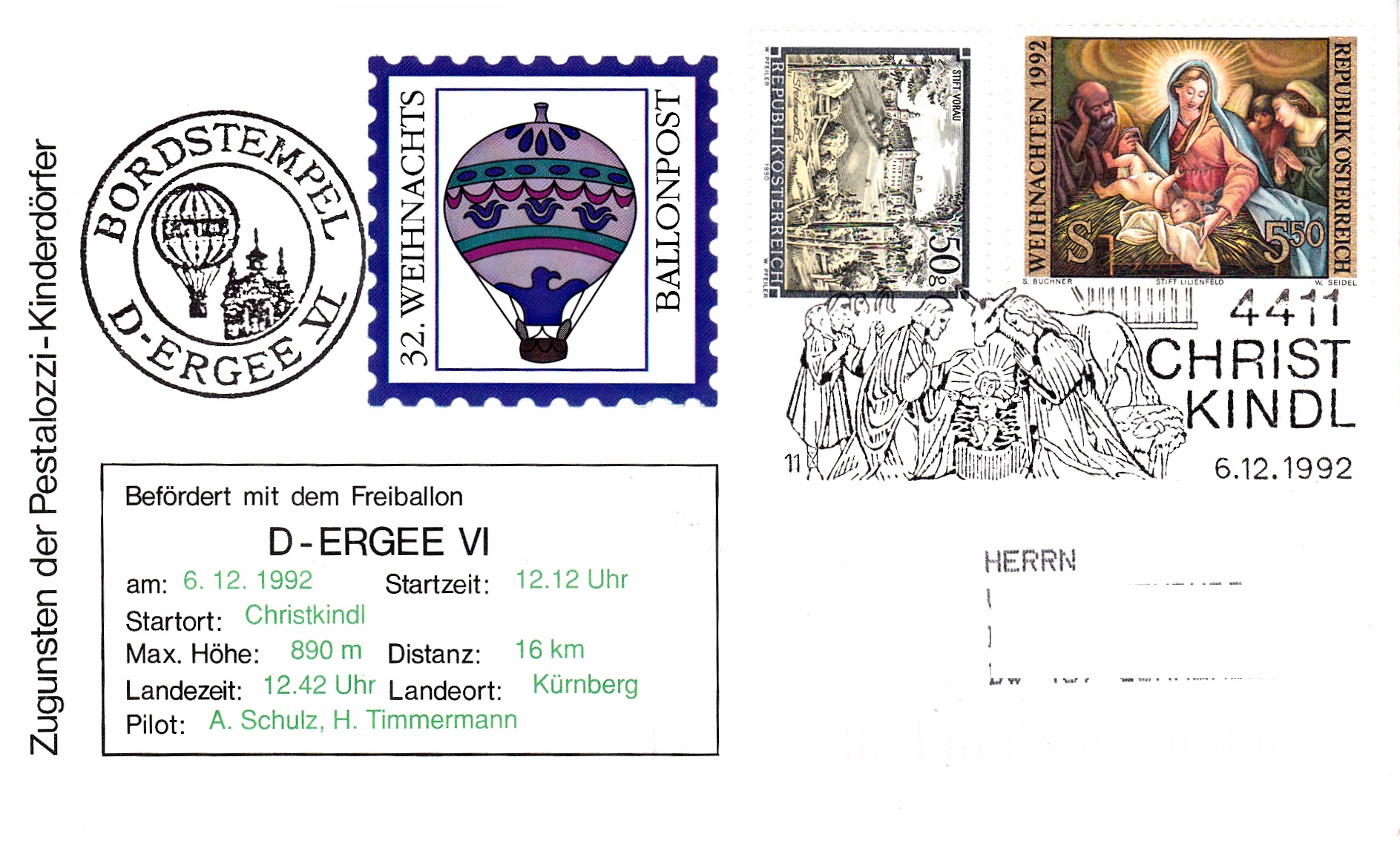 Auf diesem Briefumschlag der 32. Weihnachtsballonpost wurde die Marke am 6.12.1992 mit dem Stempel mit der Kennziffer "6" gestempelt.