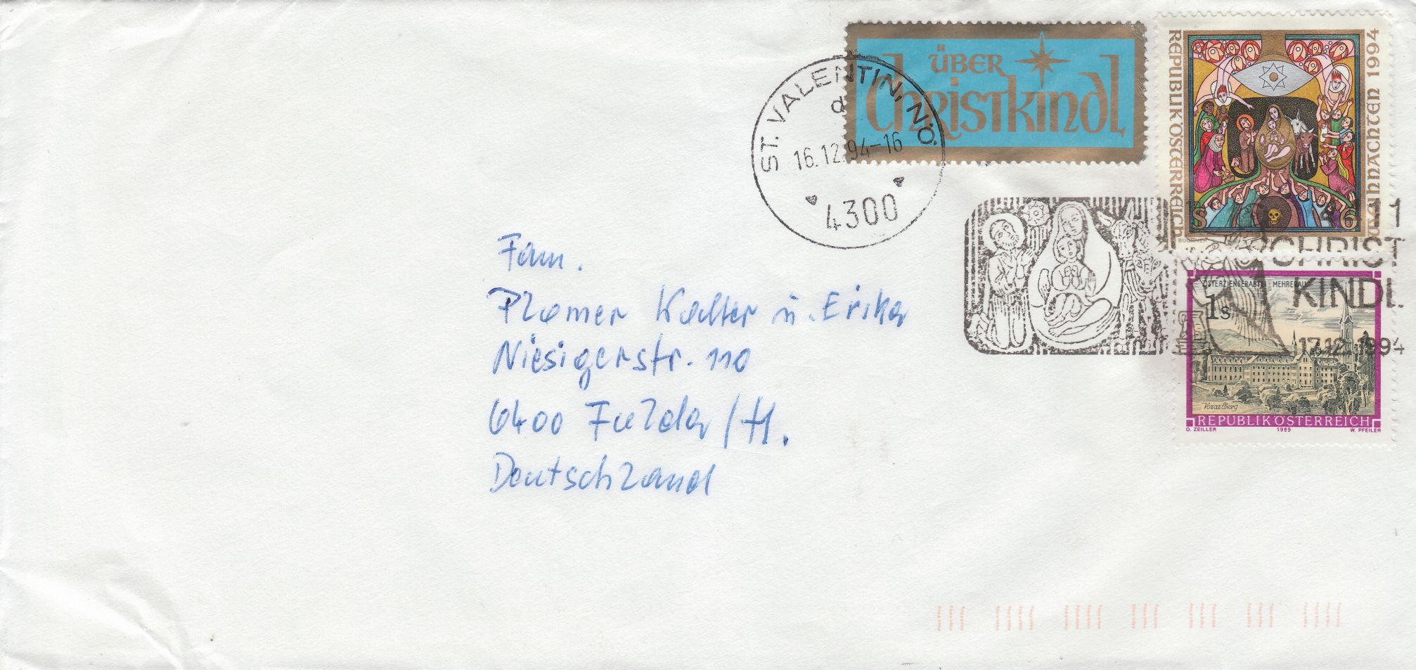 Dieser mit dem Klebezettel "über CHRISTKINDL" versehene Beleg wurde am 16.12.1994 in "ST. VALENTIN" in Niederösterreich aufgegeben.