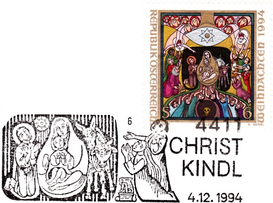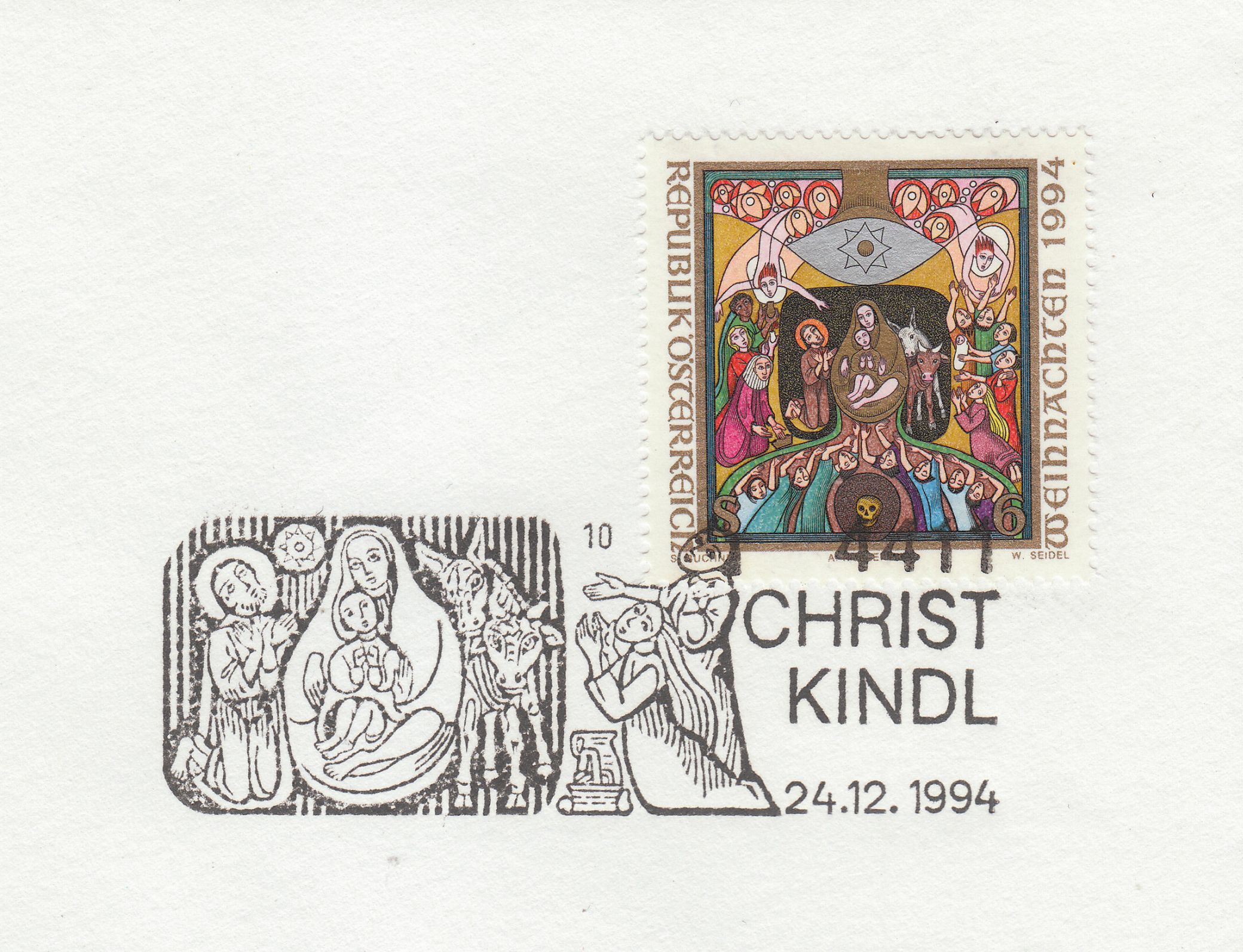 Weihnachtsmarke 1994 von Österreich, am 24.12.1994 = Heiligabend gestempelt mit dem Sonderstempel Christkindl mit der Kennziffer "10":