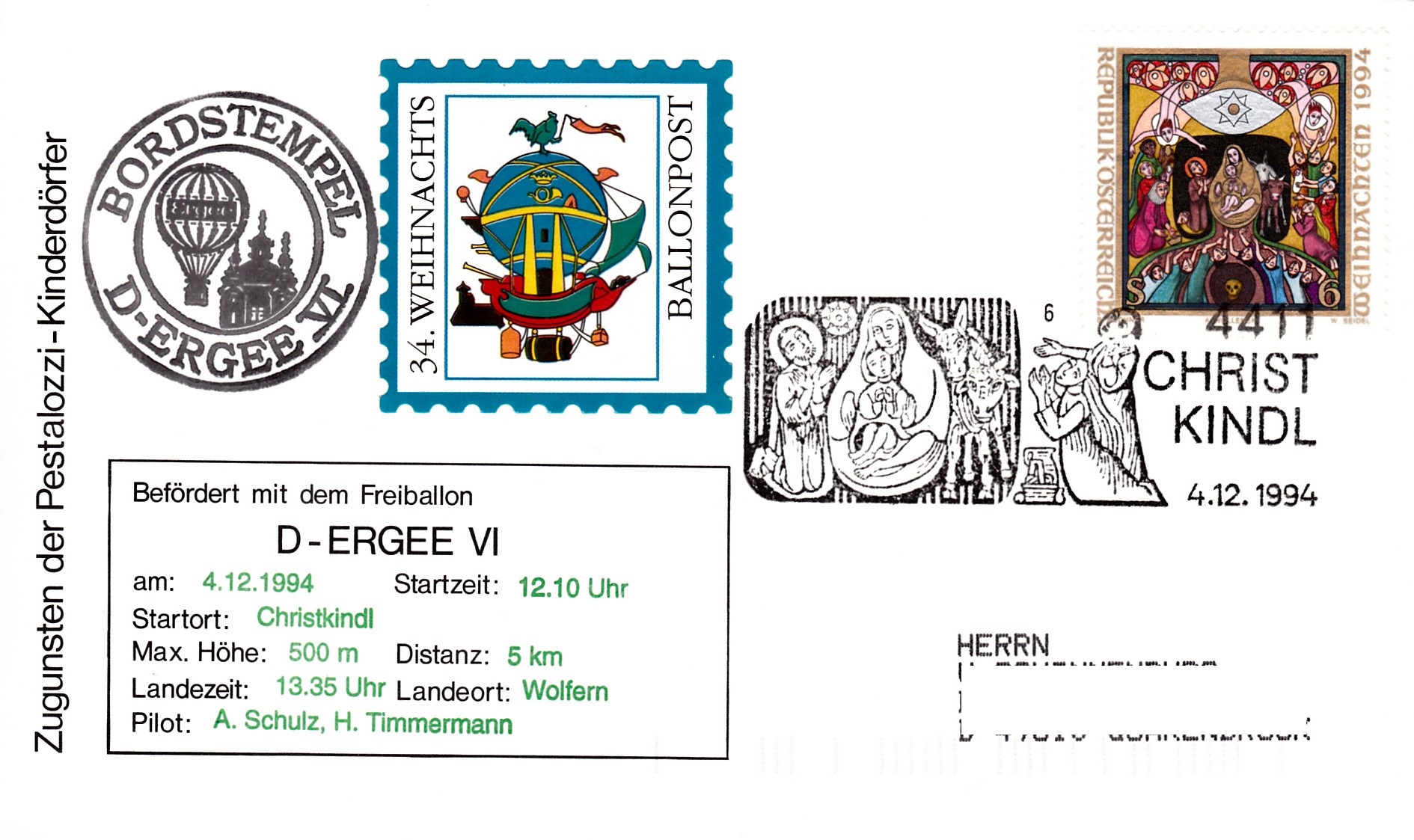 Die Frankatur wurde dementsprechend am 17.12.1994 in Christkindl per Sonderstempel entwertet: