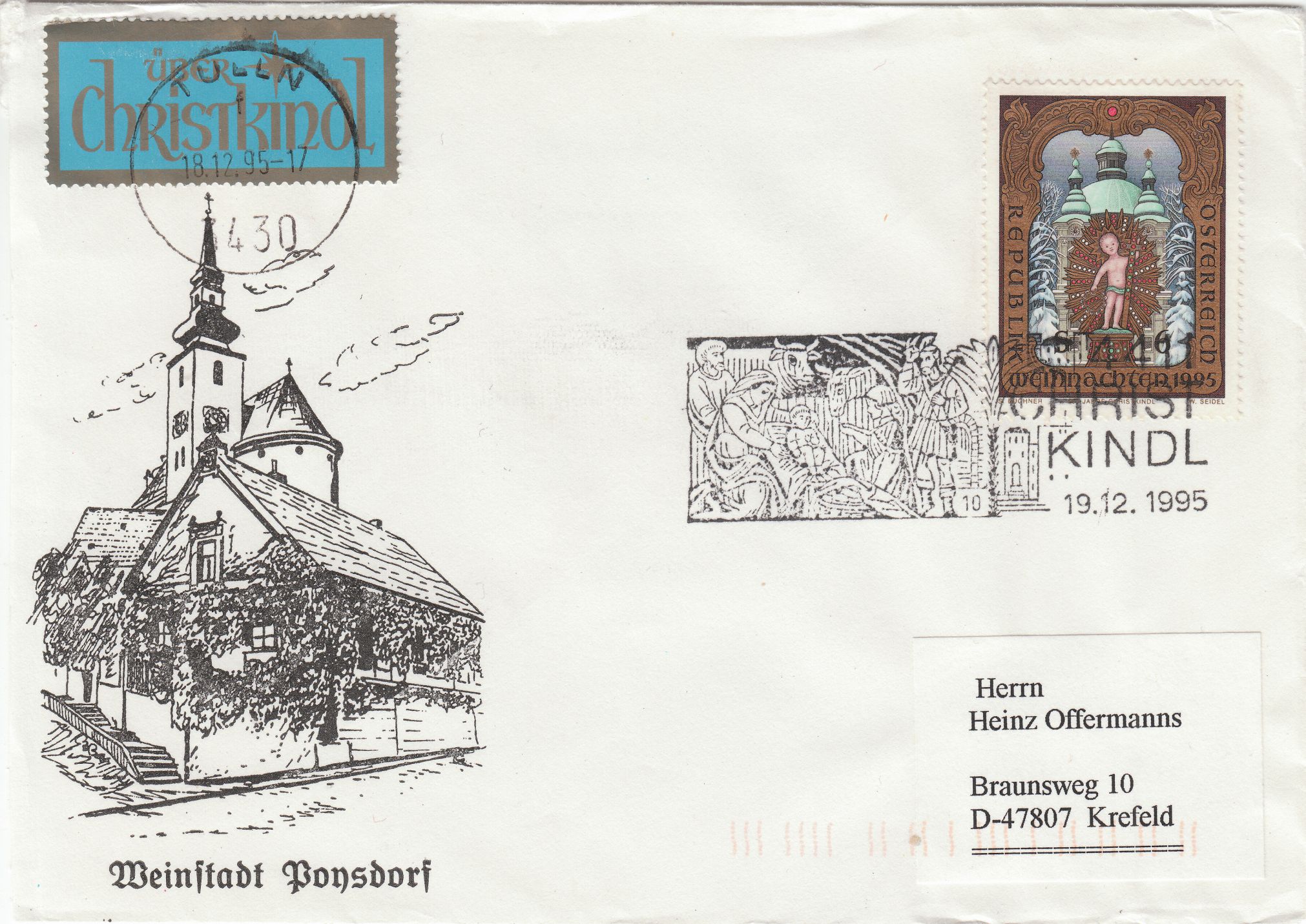 Dieser Brief wurde am 1.12.1995, dem Ersttag der Weihnachtsmarke 1995 mit dem Stempel mit der Kennziffer "15" gestempelt.