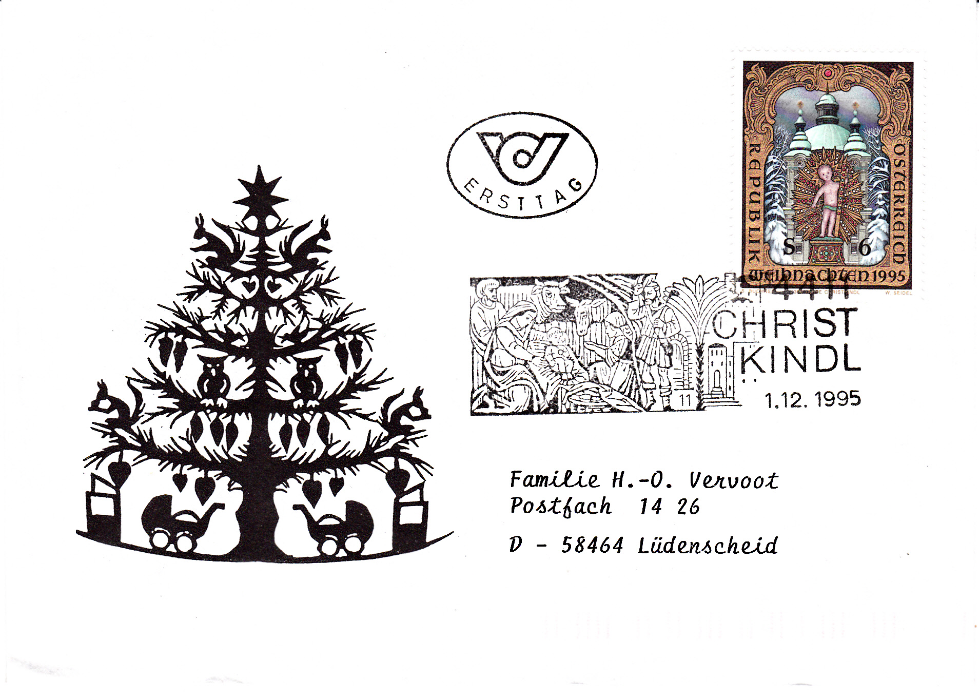 Dieser Brief wurde am 1.12.1995, dem Ersttag der Weihnachtsmarke 1995 mit dem Stempel mit der Kennziffer "11" gestempelt.