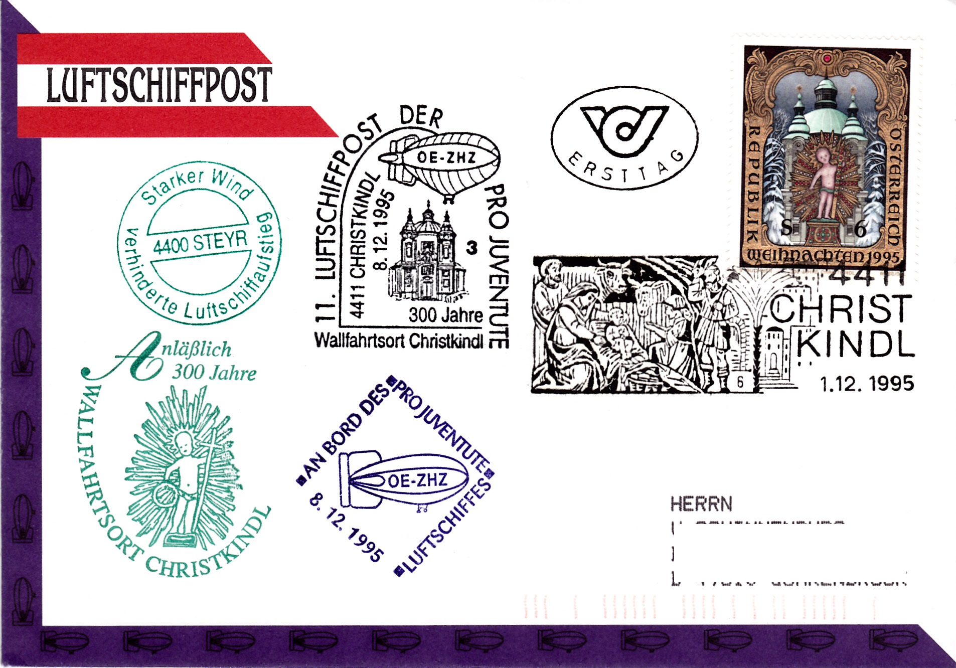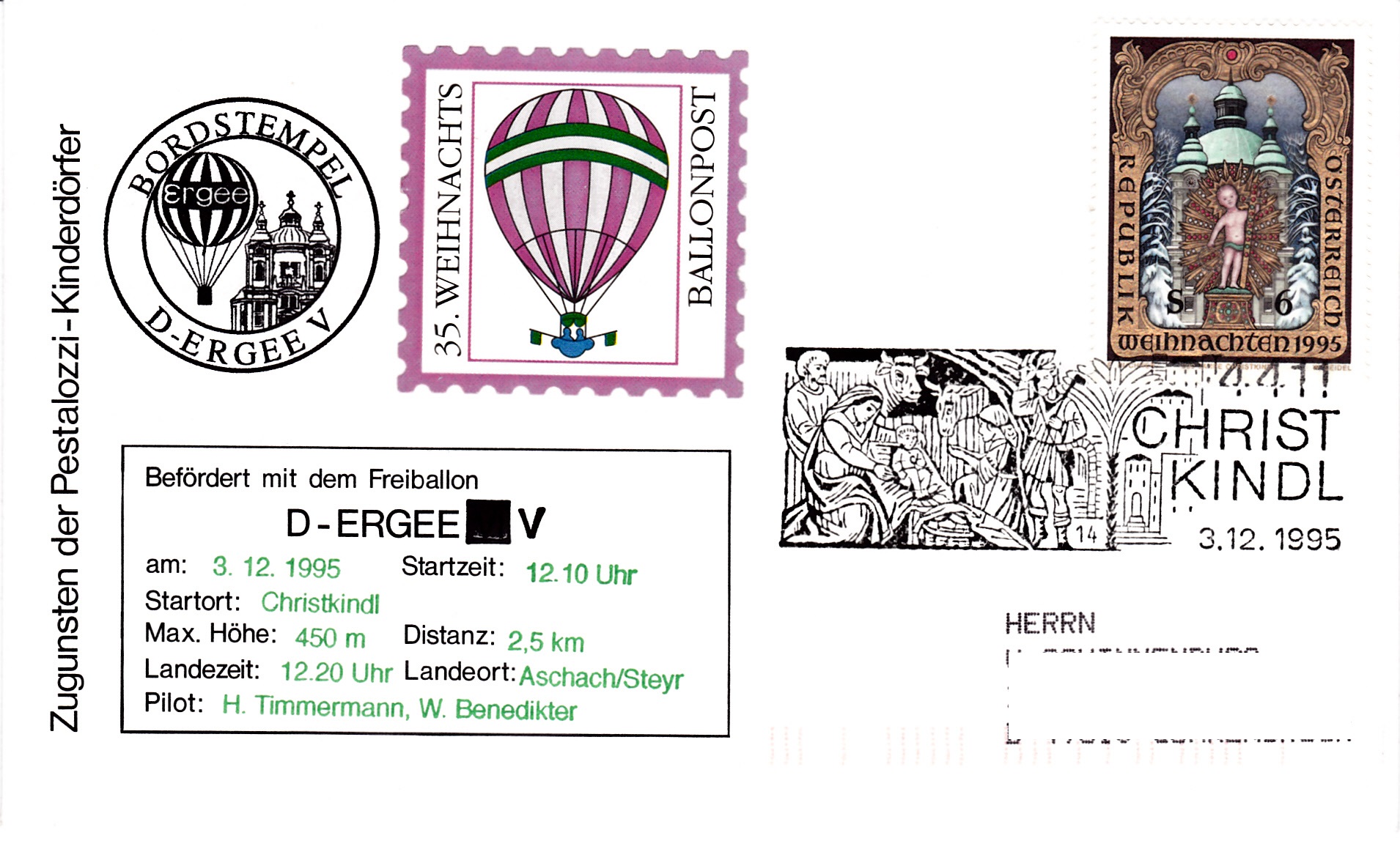 Auf diesem für die 11.Luftschiffpost der Pro Juventute vorgesehenen Brief wurde am 1.12.1995 (dem Ausgabetag der Weihnachtsmarke 1995) der Sonderstempel Christkindl mit der Kennziffer "6" verwendet.