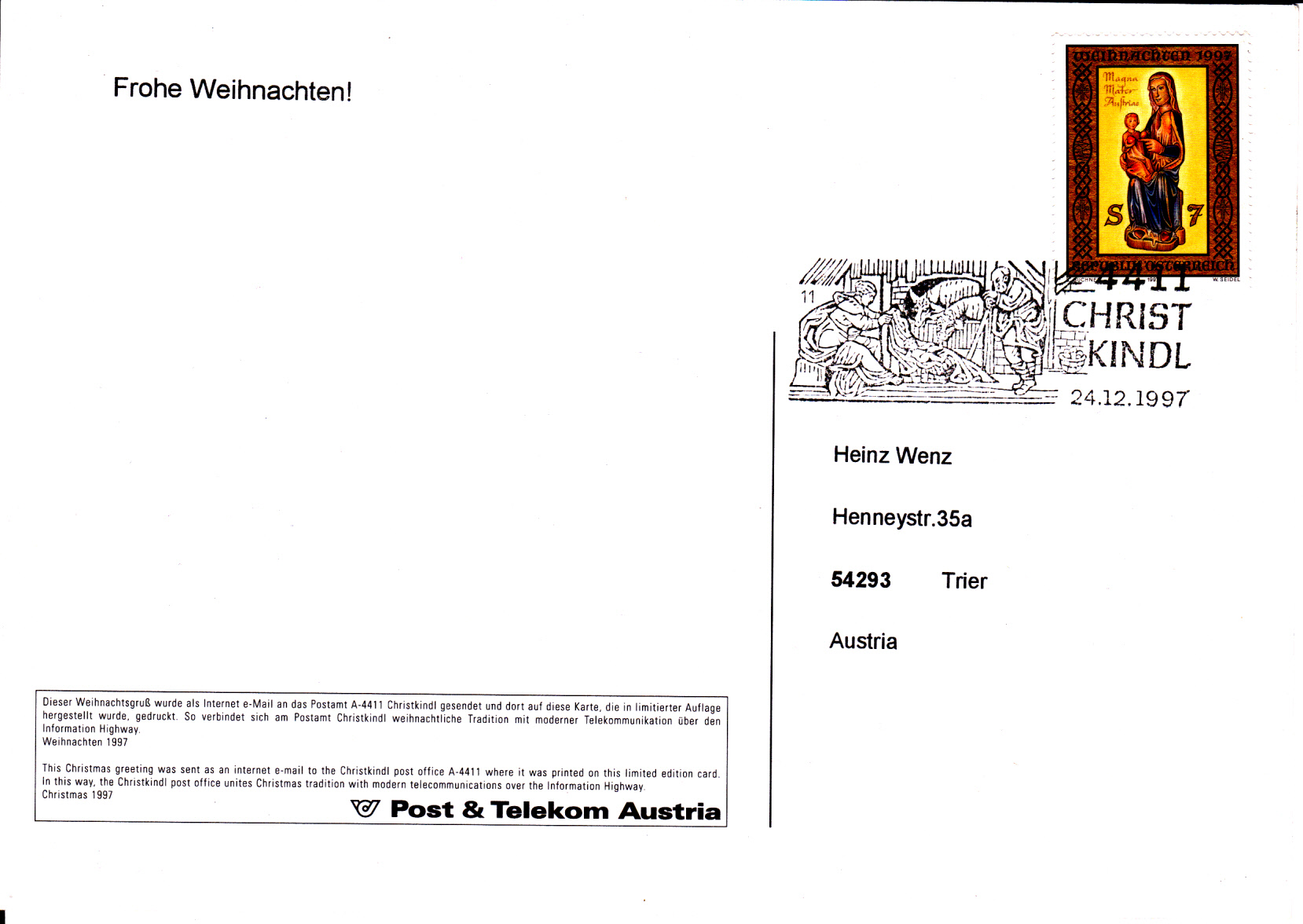Hier zeige ich einen Weihnachtsgruß der Österreichischen Post mit Sonderstempel vom 24.12.1997 (Kennziffer 11) des Postamtes Christkindl auf einer Internet X-Mas Card. Wie der Text auf der Karte unten links aussagt, wurde der Weihnachtsgruß per e-mail an das Postamt geschickt. Dort wurde er auf die Karte gedruckt und versandt. Die Karte ist im Format DIN A5, also größer als eine normale Postkarte.