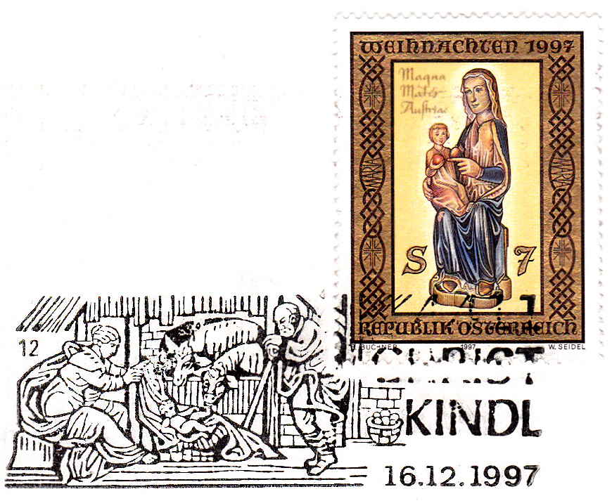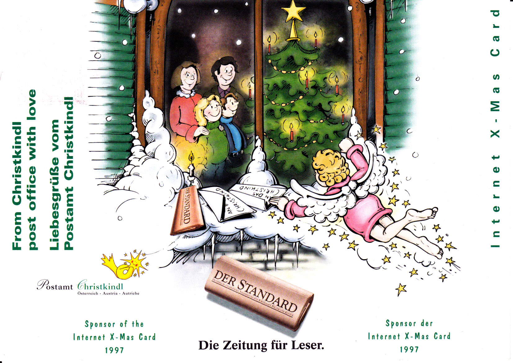Hier zeige ich einen Weihnachtsgruß der Österreichischen Post mit Sonderstempel vom 24.12.1997 (Kennziffer 11) des Postamtes Christkindl auf einer Internet X-Mas Card. Wie der Text auf der Karte unten links aussagt, wurde der Weihnachtsgruß per e-mail an das Postamt geschickt. Dort wurde er auf die Karte gedruckt und versandt. Die Karte ist im Format DIN A5, also größer als eine normale Postkarte.