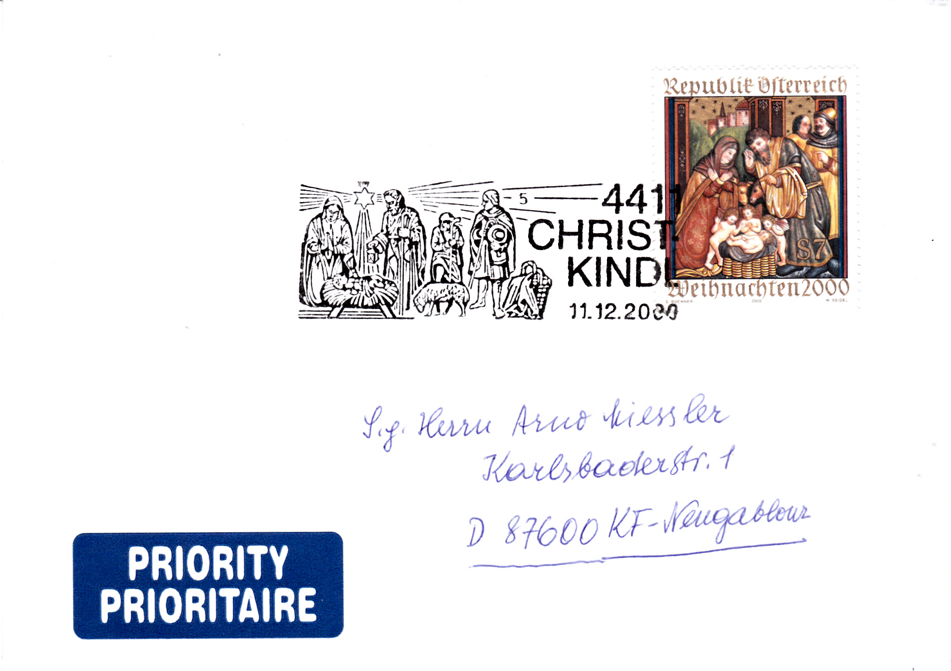 Dieser Sonderstempel Christkindl vom 3.12.2000 hat die Kennziffer "1" und wurde auf einem Umschlag zur 40. Weihnachtsballonpost abgeschlagen.