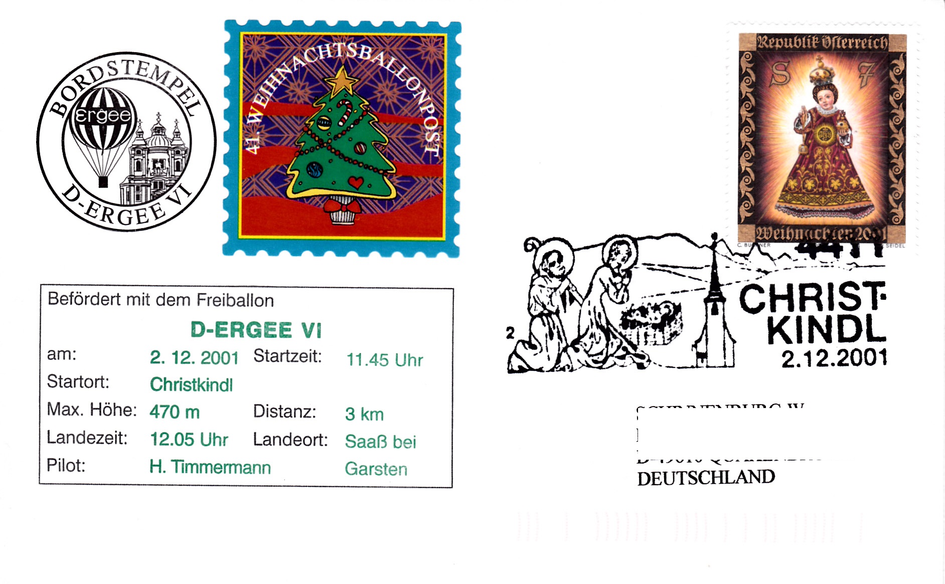 Dieser Sonderstempel Christkindl vom 30.11.2001 mit der Kennziffer "1" wurde auf einem Ganzsachenumschlag (MiNr U102) mit einem Wertstempel "Inland" am Ersttag der Ganzsache verwendet.