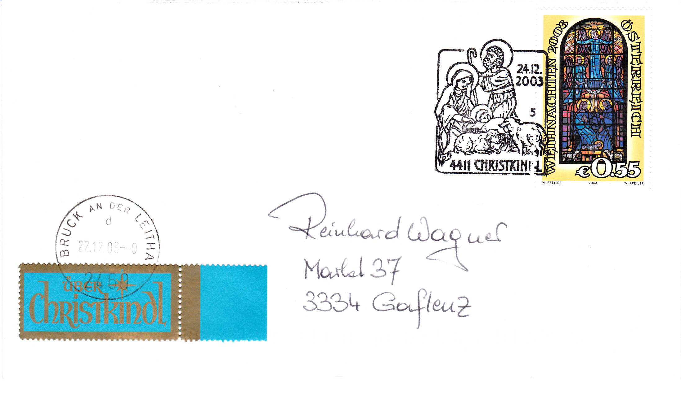Dieser Beleg wurde am 22.12.2003 mit dem Aufkleber Über Christkindl in Bruck an der Leitha aufgegeben und ging über Christkindl nach Gaflenz. In Christkindl erhielt er am 24.12.2003 den Sonderstempel mit der Kennziffer "5".