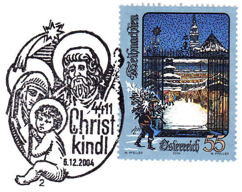 Hier wurde der Sonderstempel des Postamtes Christkindl des Jahres 2004 mit Datum 6.12.2004 mit der Kennziffer "2" auf einem Brief mit Leitzettel "über Postamt CHRISTKINDL" abgeschlagen: