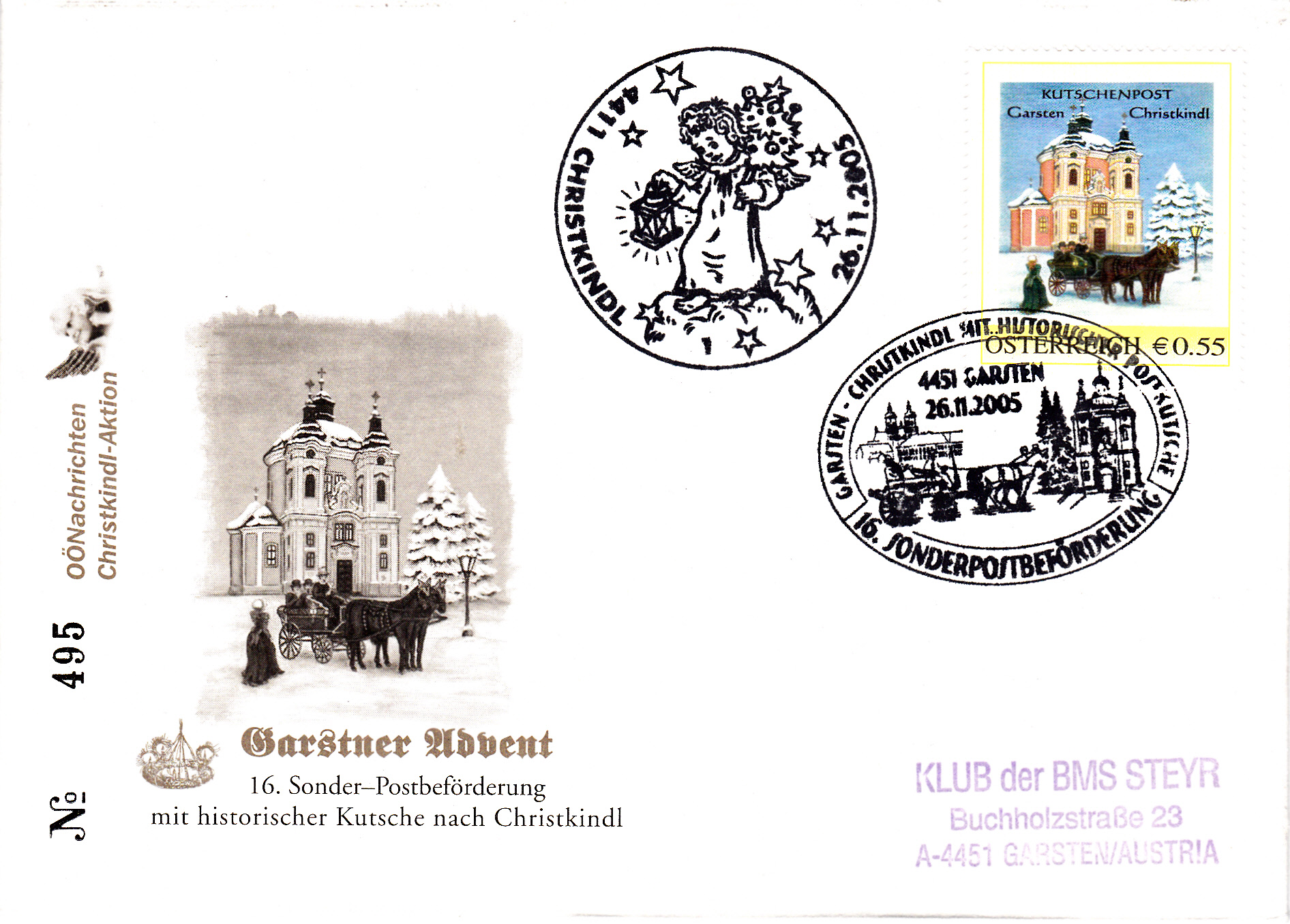 Brief von der 16. Sonderpostbeförderung mit Kutsche von A-4451 Garsten nach A-4411 Christkindl. Zur Frankatur wurde eine Marke aus dem Angebot der Österreichischen Post "Meine Marke" (MiNr 2456) mit Motiv "Gnadenkirche in Christkindl" benutzt. Die Marke wurde im Startort Garsten mit dem Sonderstempel zur Sonderpostbeförderung gestempelt. Der Brief erhielt in Christkindl den Sonderstempel aus Christkindl als Ankunftsstempel. Dieser Ankunftsstempel hat die Kennziffer "1".