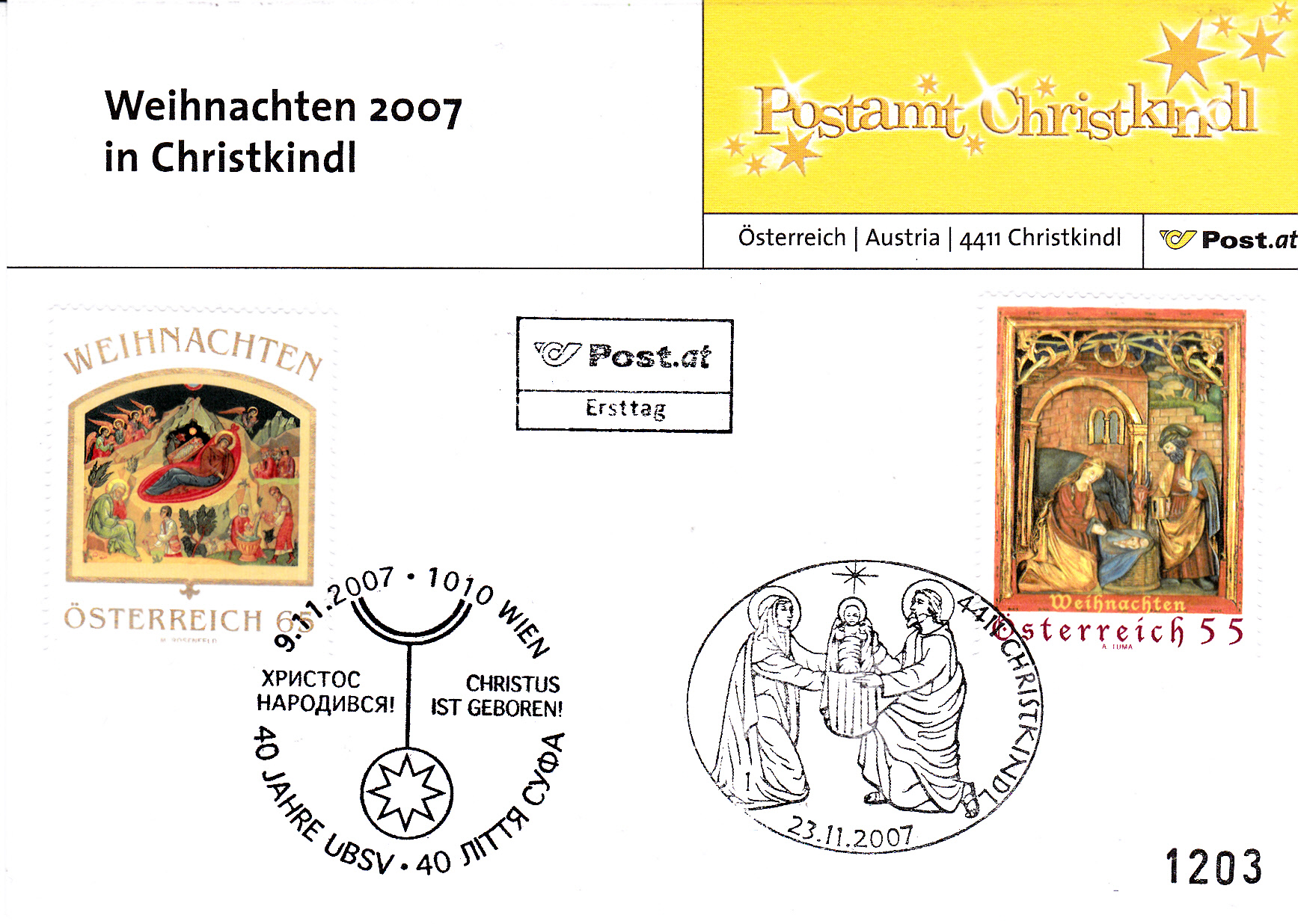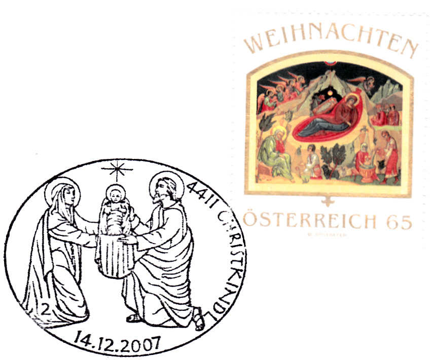 Er ist auf einer Stempelkarte des PA Christkindl zusammen mit der am 9.11.2007 erschienenen Weihnachtsmarke zu 65 Cent, die mit einem anderen SST vom 9.11.2007 gestempelt wurde.
