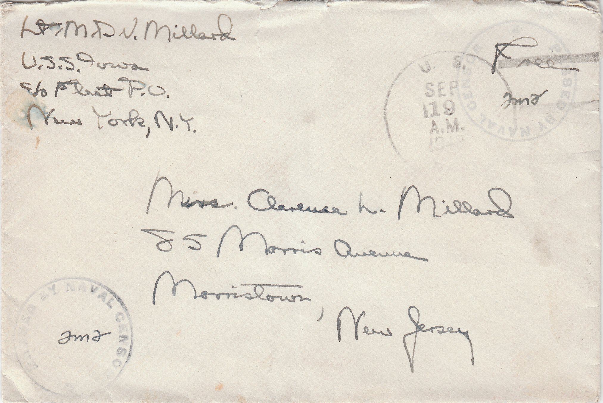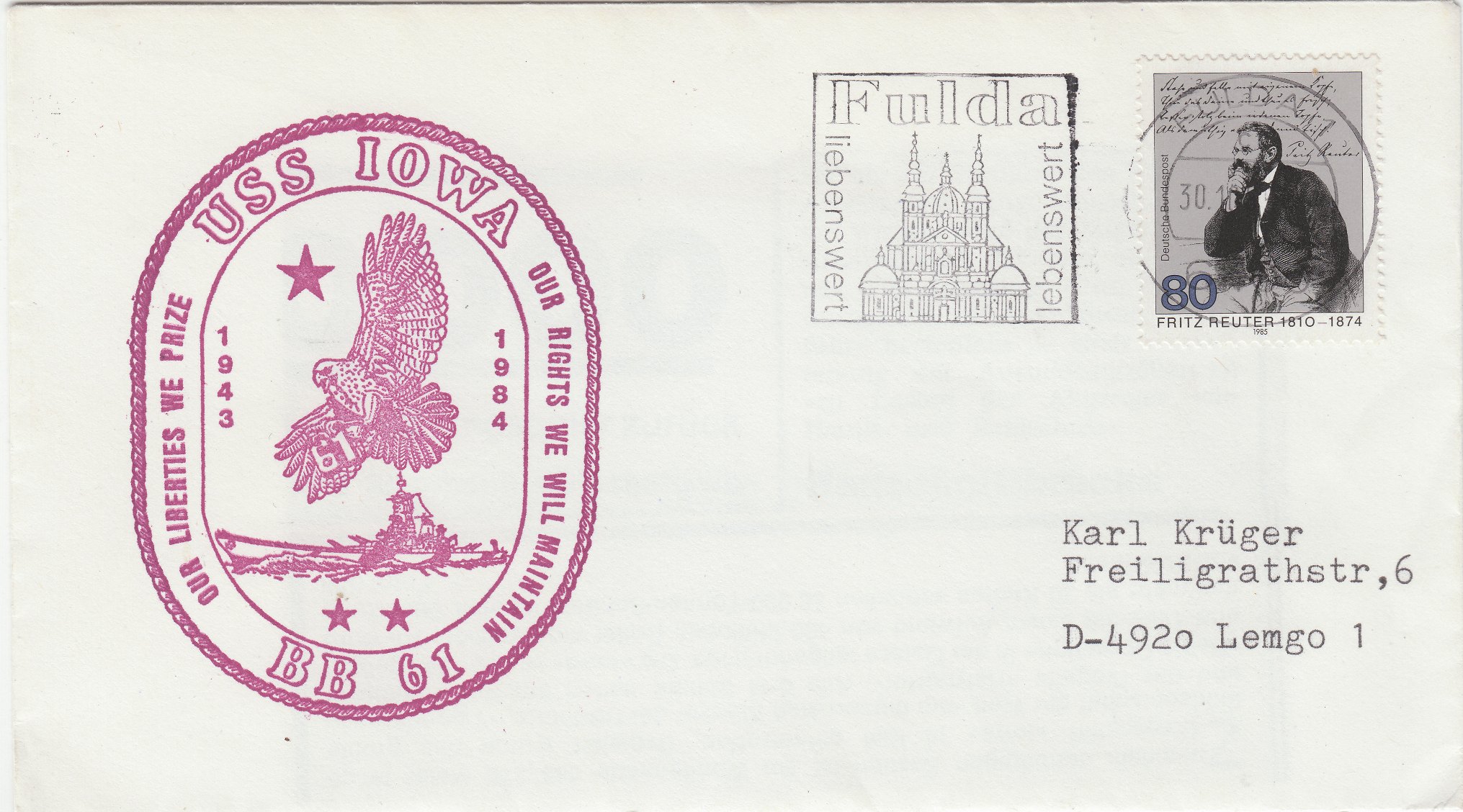 Dieser Beleg dokumentiert per Cachetstempel den Hafenbesuch der USS IOWA BB-61 in Bremerhaven.