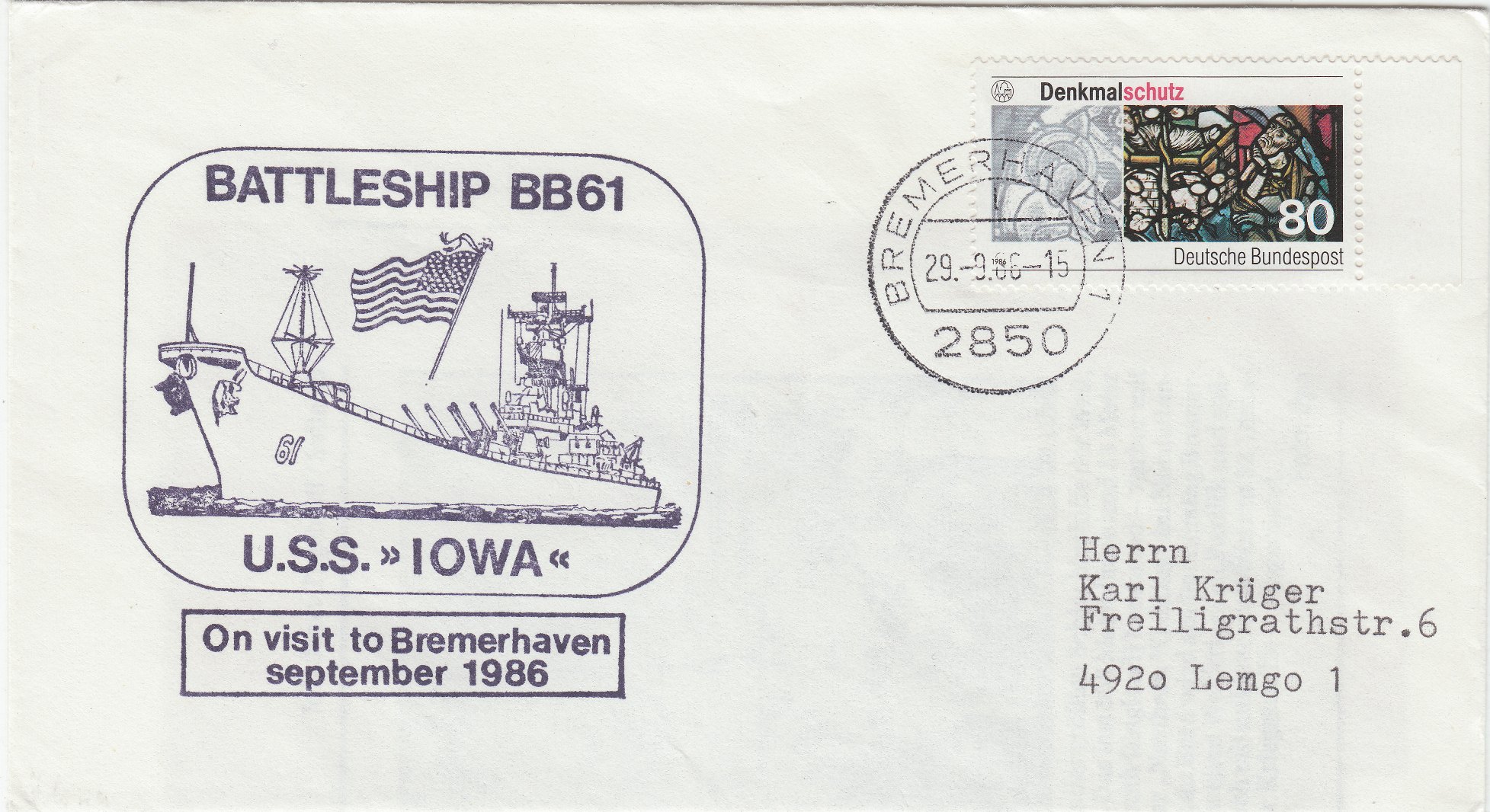 Dieser Beleg dokumentiert per Cachetstempel den Hafenbesuch der USS IOWA BB-61 in Bremerhaven.