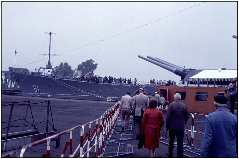 Hier zwei während dieses Besuches in Bremerhaven aufgenommene Fotos aus dem Diaarchiv von Alfred Schmidt, zunächst ein Blick auf den achteren Geschützturm, aufgenommen vom Hubschrauber-Landedeck aus: