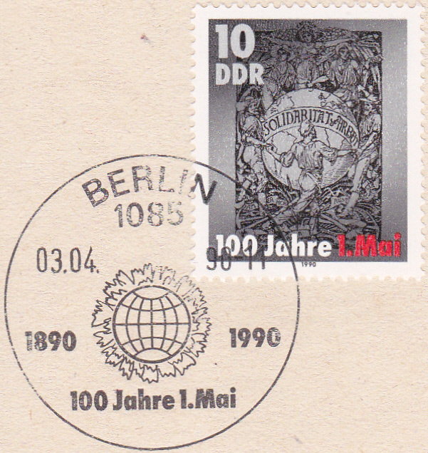 In der DDR ist 1990 diese Marke (MiNr 3322) zum 1. Mai erschienen. Sie zeigt ein Historisches Mai-Schmuckblatt (um 1890).