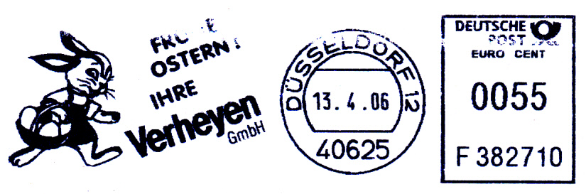Zahlreiche Firmen nutzen ihren Absenderfreistempel in der Osterzeit dazu, ihren Kunden Frohe Ostern zu wünschen. Hier ein Beispiel einer Firma Schindler aus Neuss aus dem Jahre 2006.