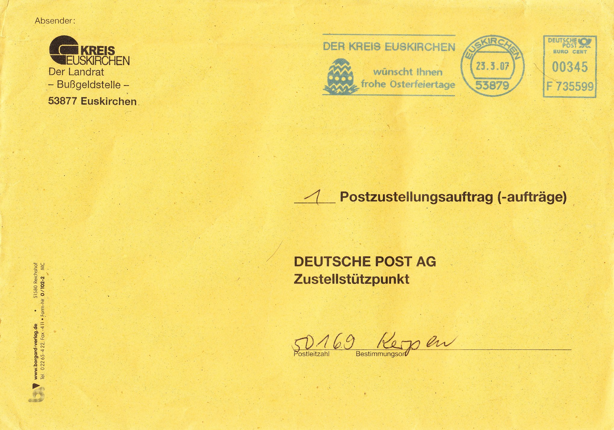 In diesem Falle wurde ein Postzustellungsauftrag der Portostufe 3,45 € damit frankiert: