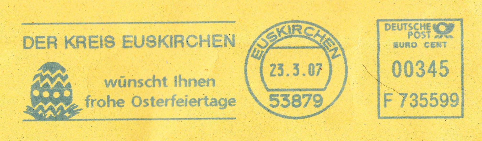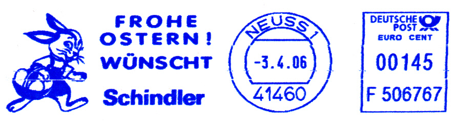 Zahlreiche Firmen nutzen ihren Absenderfreistempel in der Osterzeit dazu, ihren Kunden Frohe Ostern zu wünschen. Hier ein Beispiel einer Firma Schindler aus Neuss aus dem Jahre 2006.