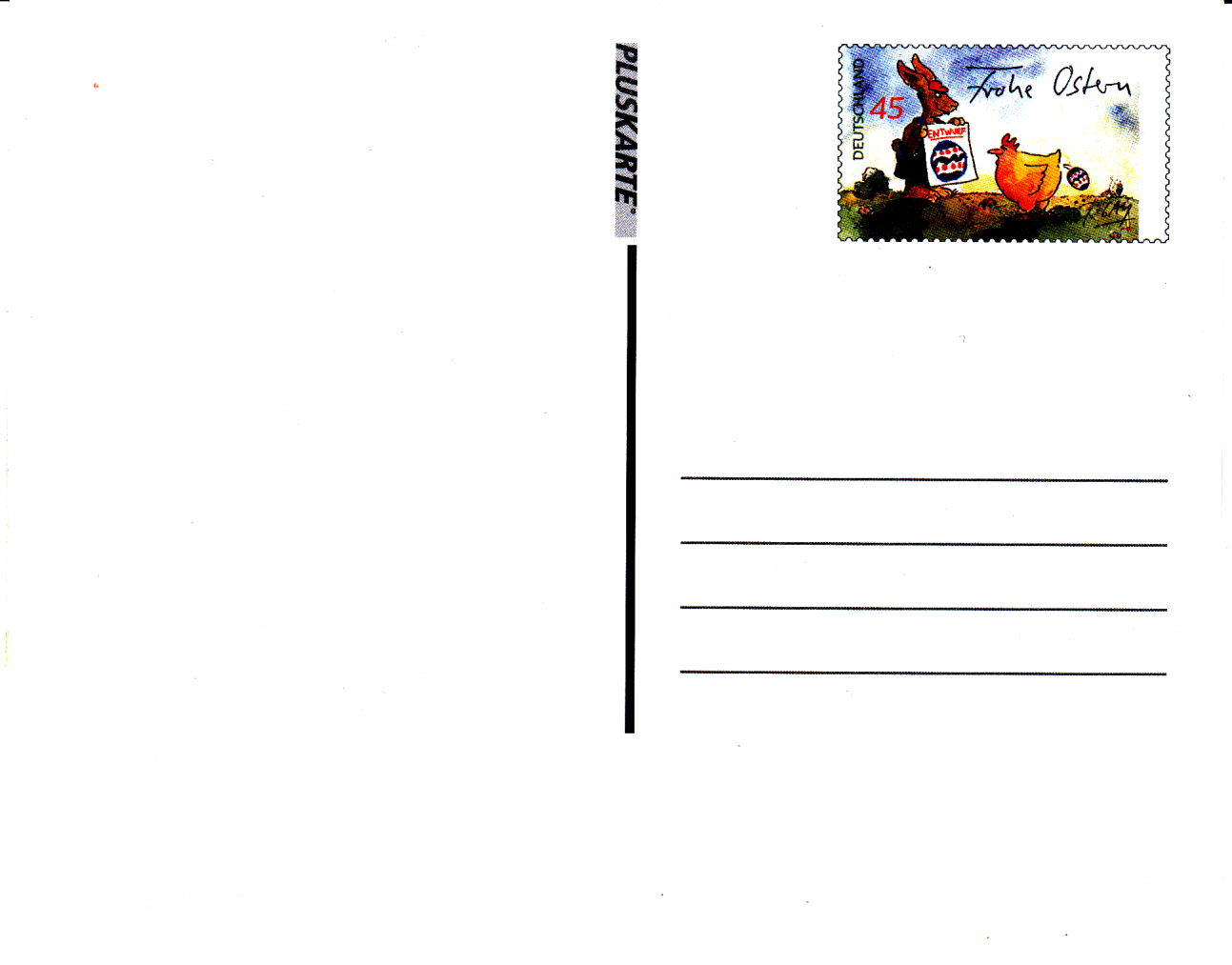Seit Anfang März 2014 verkauft die Deutsche Post über ihre Filialen und Postshops ein Pluskartenset mit 3 Karten mit dem Wertstempel der MiNr 3063 mit einer Zeichnung von Peter Gaymann (*1950, Cartoonist und Schriftsteller) mit dem Titel "Der Ostereientwurf ". Auf der Bildseite ist jeweils ein Cartoon von P.Gaymann mit Motiv "Hühner" zu sehen.