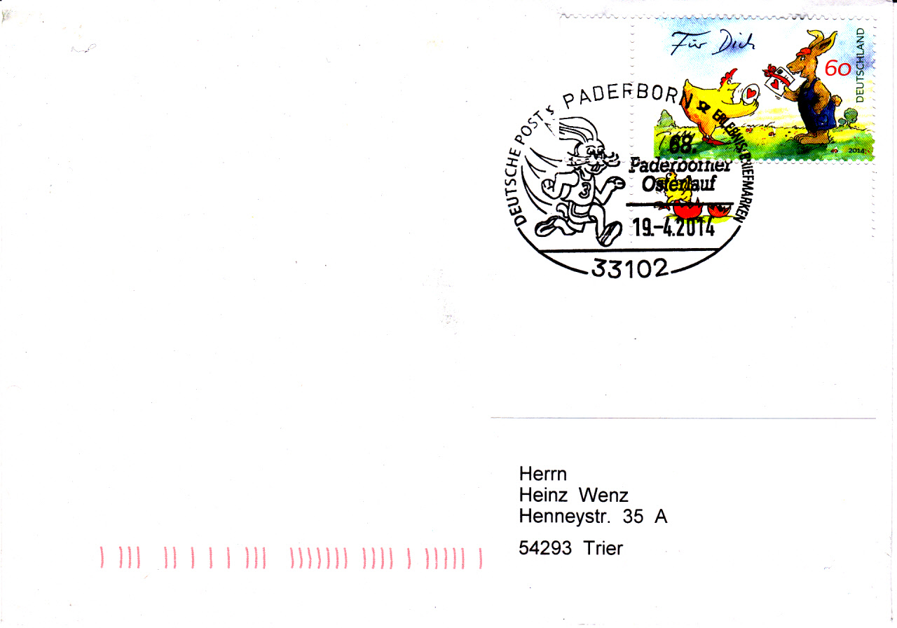 Ein weiterer schöner Sonderstempel zum Thema Ostern aus 33102 Paderborn zum "Paderborner Osterlauf" vom 19.4.2014. Im Stempelbild ein Osterhase als Teilnehmer am Osterlauf.