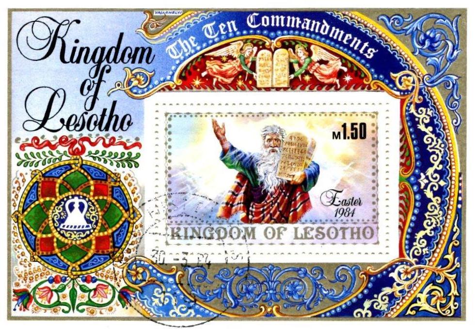 Dieser Block aus Lesotho erschien 1984 zu "Ostern" = "Easter" und zeigt Moses mit den zwei Steintafeln, auf denen "Die Zehn Gebote" = "The Ten Commandments" geschrieben stehen: