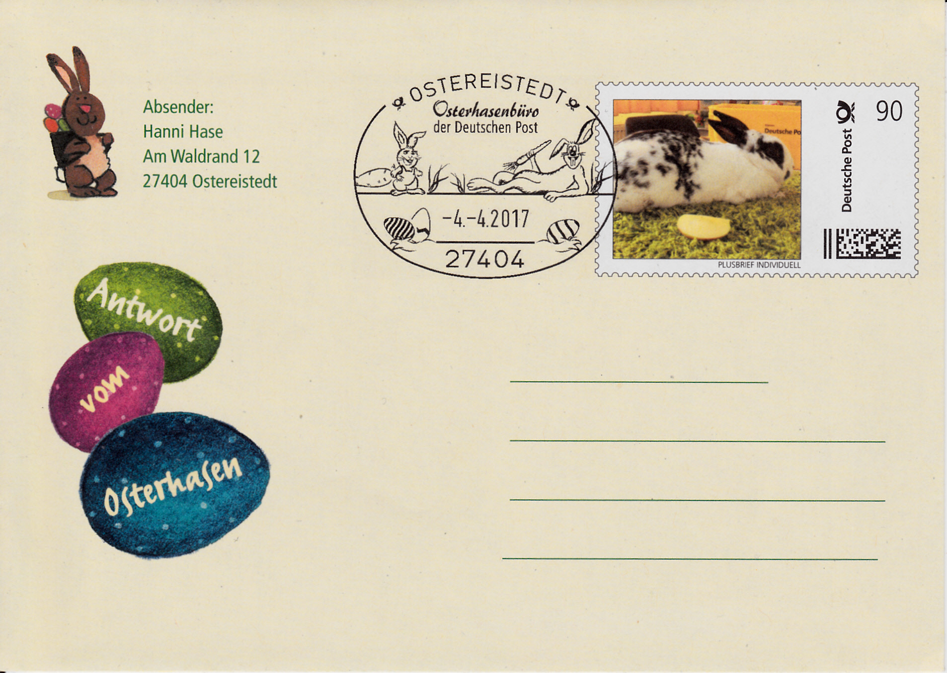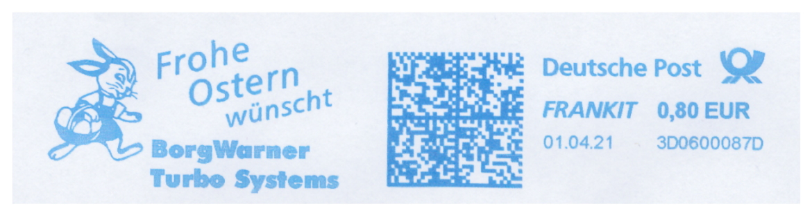 Zahlreiche Firmen nutzen ihren Absenderfreistempel in der Osterzeit dazu, ihren Kunden Frohe Ostern zu wünschen. Hier ein Beispiel einer Firma Schindler aus Neuss aus dem Jahre 2006.
